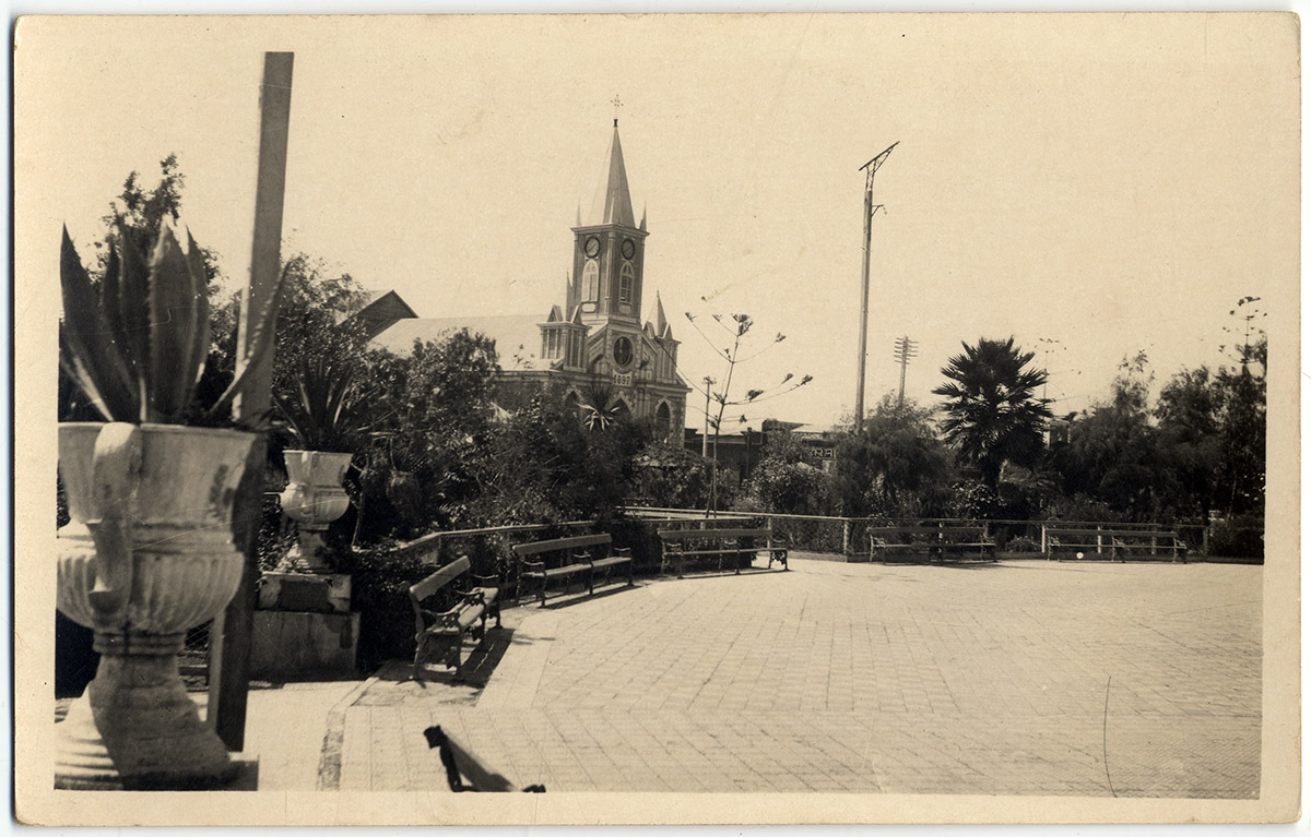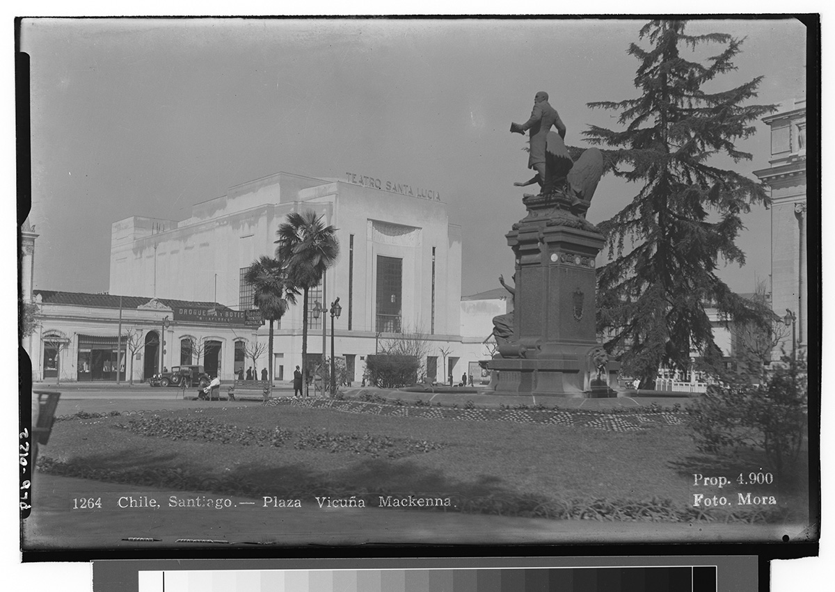 Una escultura humana sobre una piedra se encuentra en primer plano junto a una torre de ladrillo. De fondo, vista hacia una ciudad, que posee edificios de distintas alturas y arquitecturas.