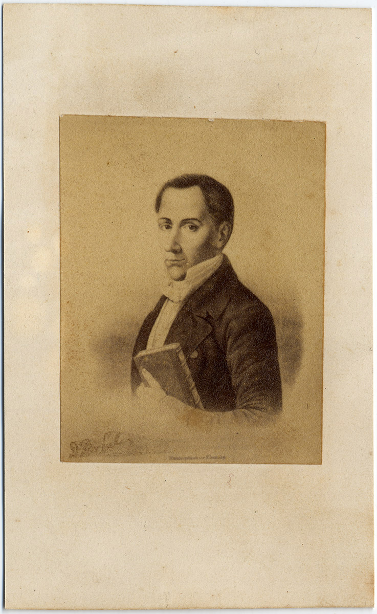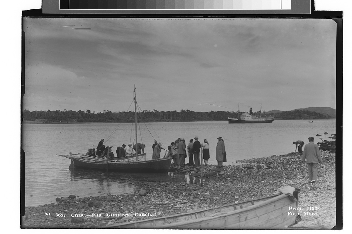Cuatro personas de pie y una sentada en la orilla de la laguna, dos apuntando hacia el centro de la laguna rodeada de bosque.