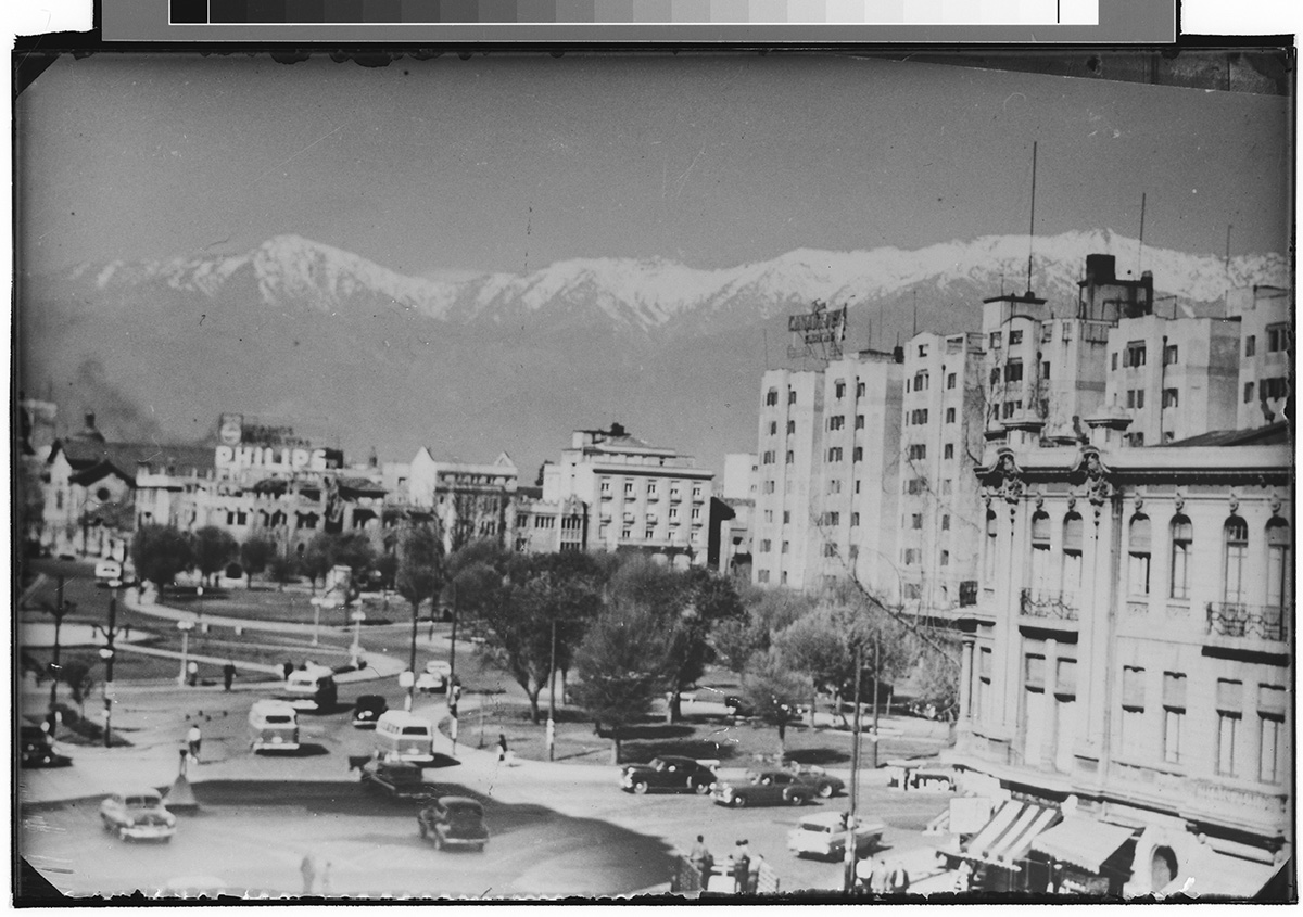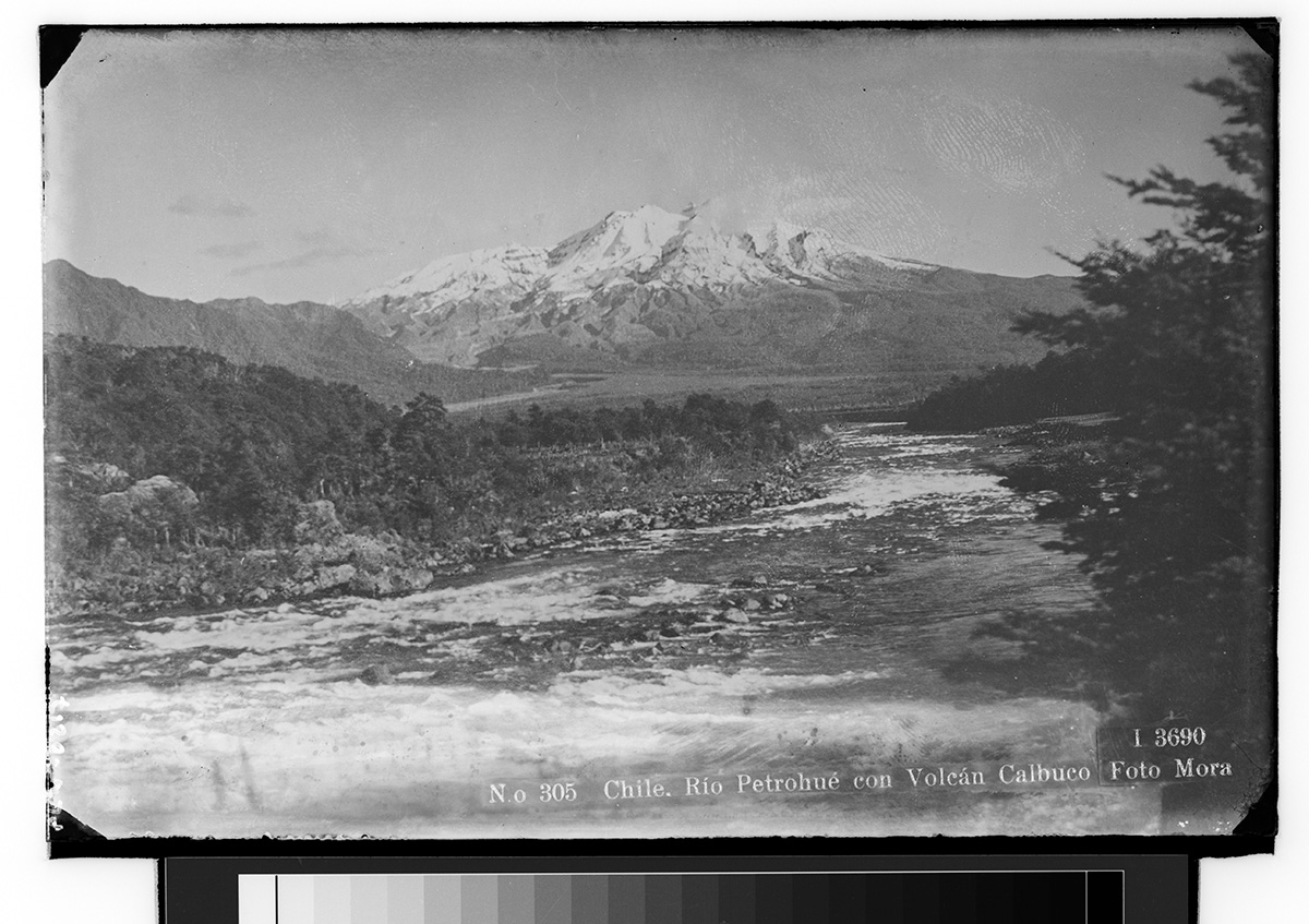 Vista desde un plano alto hacia la ciudad, en primer plano se aprecia un camino de tierra que se encamina hacia las casa, por el van personas caminando y a caballo. Al fondo se ve un lago, un volcán y la luna.
