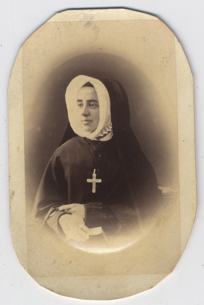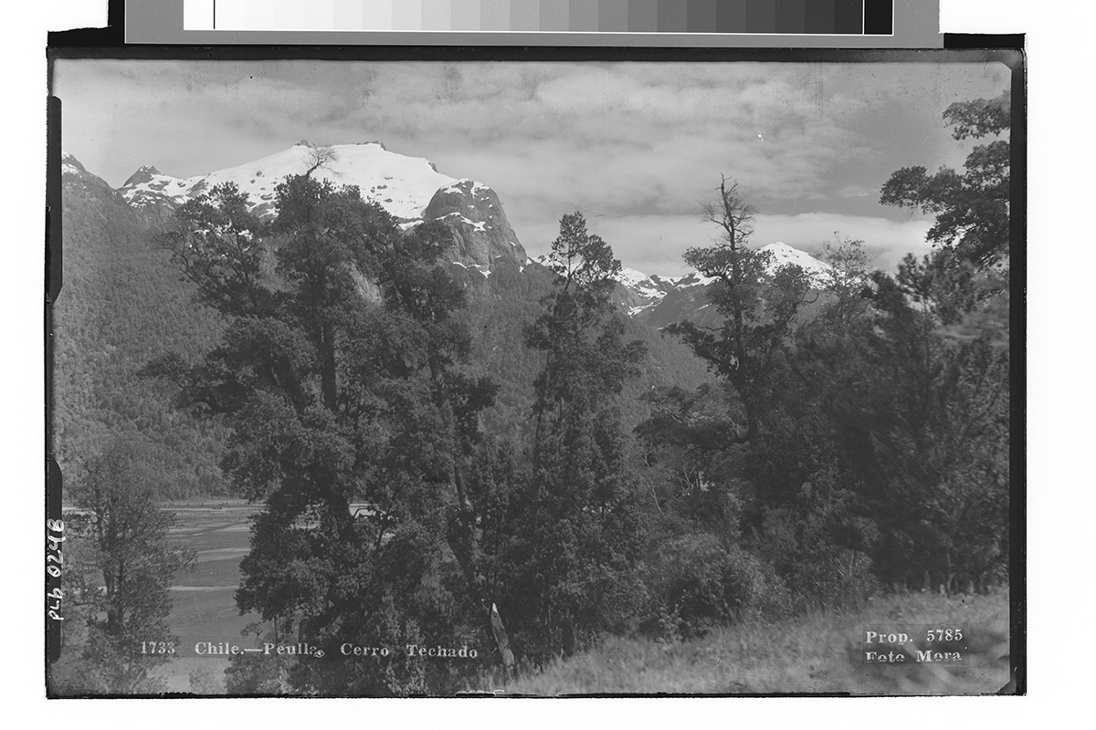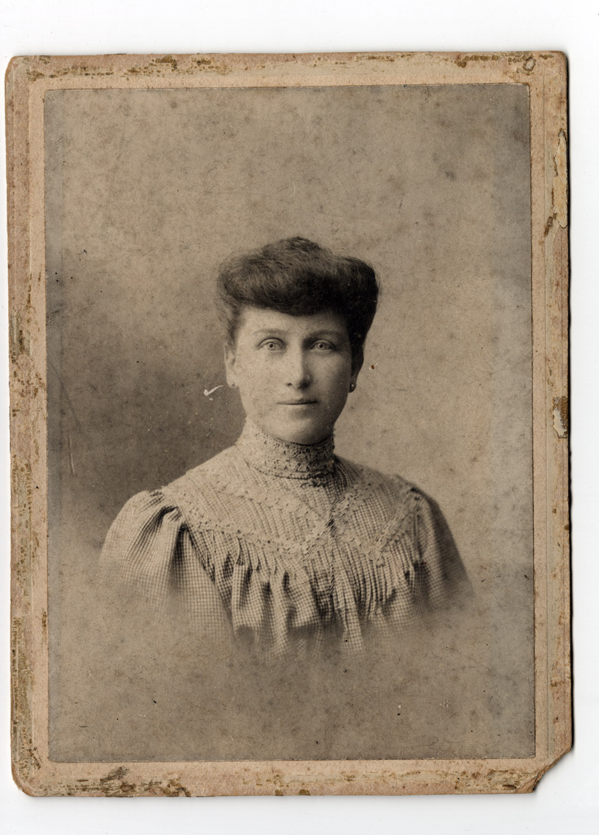 Una mujer se encuentra apoyada en la pared exterior de una casa de madera, rodeada de un paisaje campestre. También hay un perro acostado en el pasto junto a la casa. De fondo, parte de un volcán cubierto completamente de nieve.