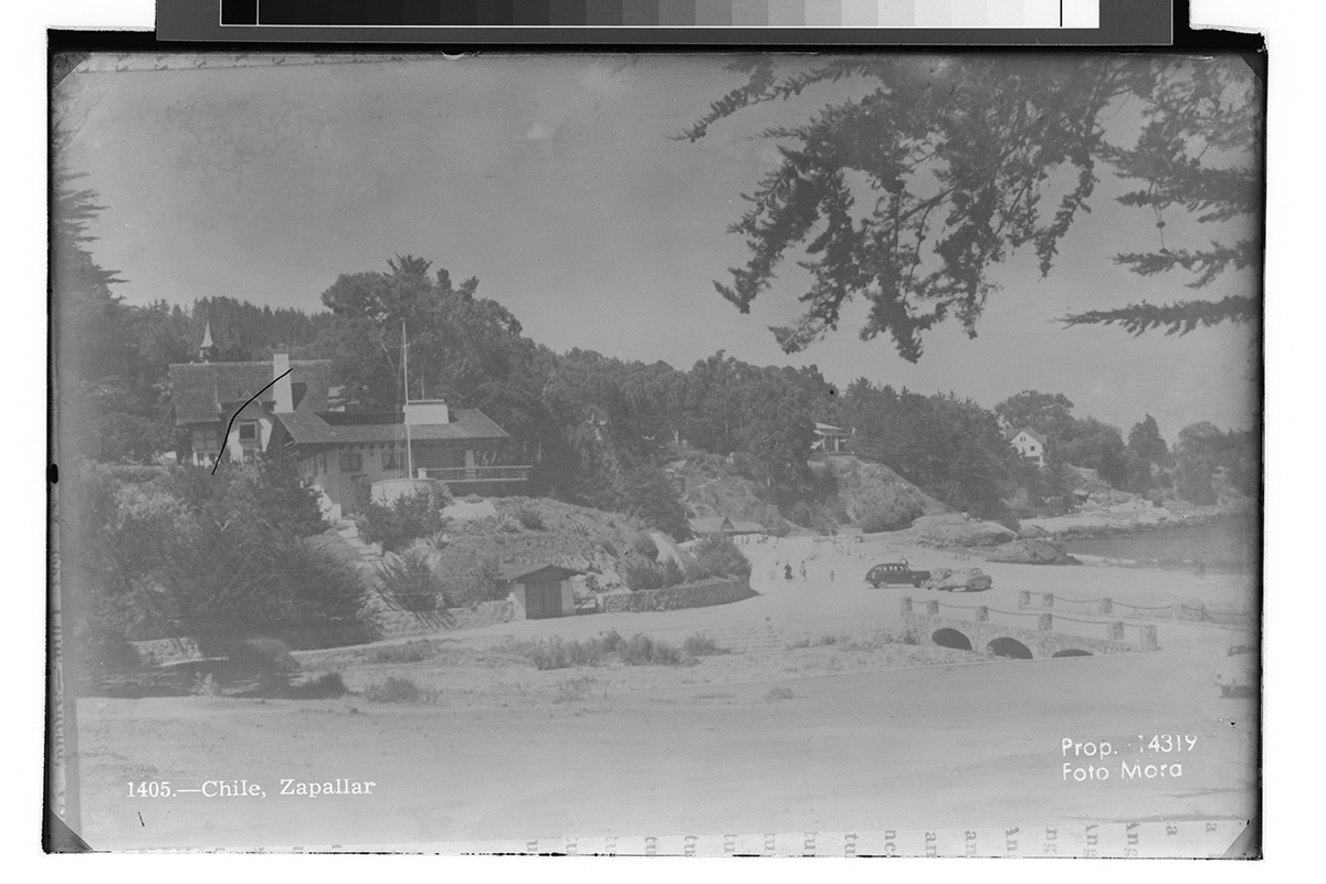 Vista casa en la orilla de la playa, automóviles estacionados entre casas y playa. Rodeado de árboles.