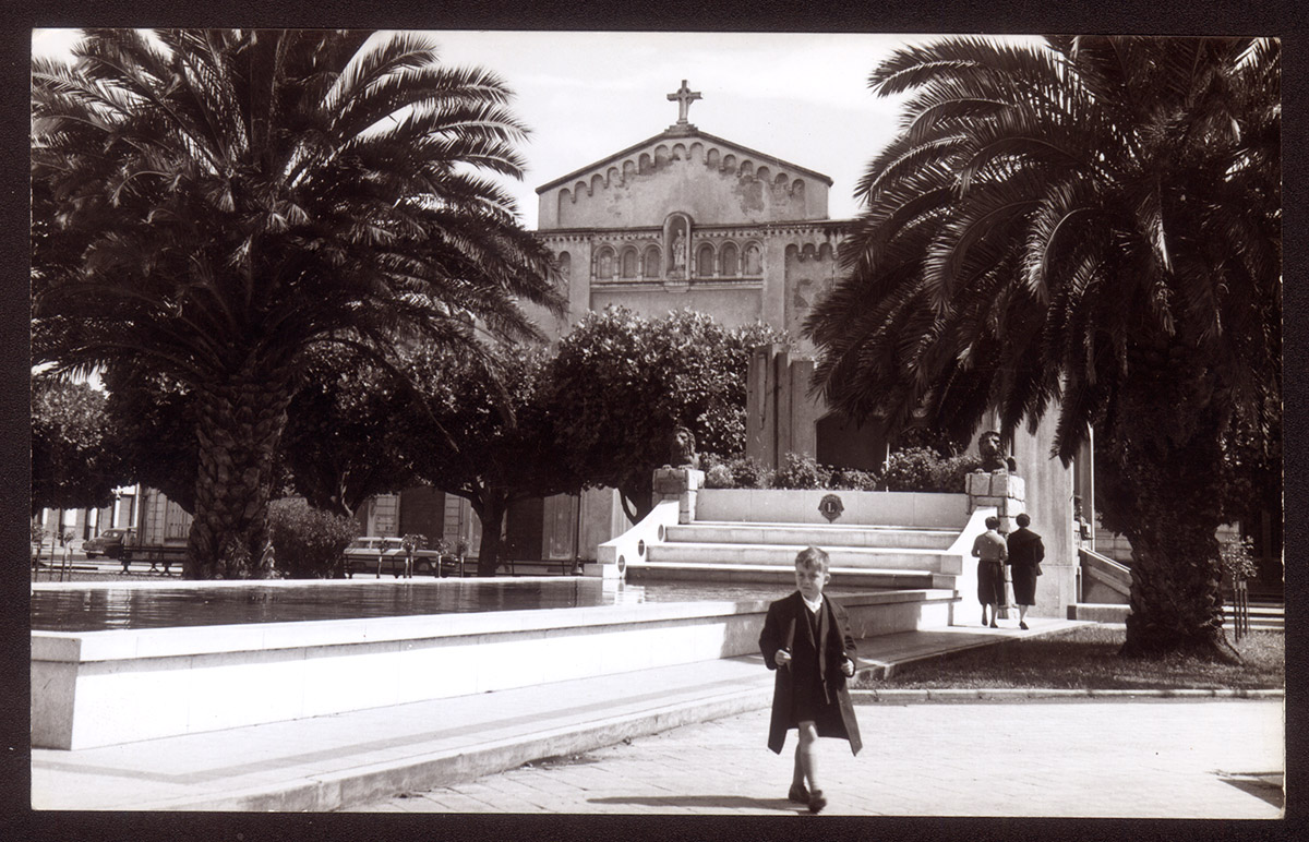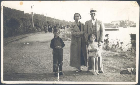 Vista bahia de rocas, el mar abajo, en la cima de una pequeña colina dos grandes construcciones.