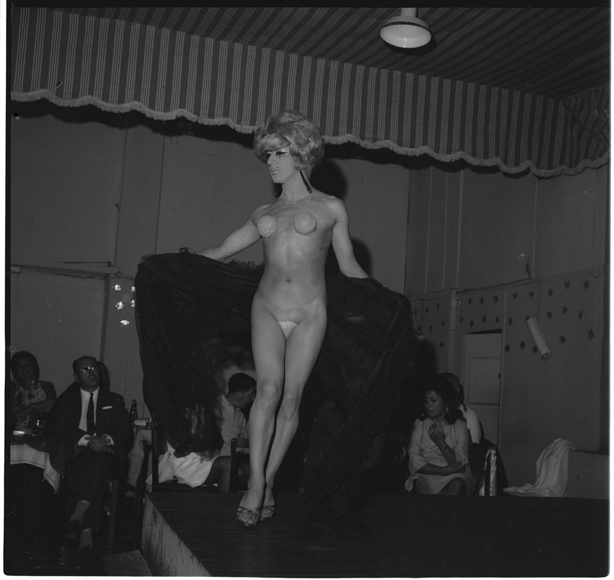 Fotografía de un desnudo realizado por un artísta sobre un escenario. Entre sus manos lleva un gran pedazo de tela oscura que lo cubre por detrás. De fondo, parte del público que se encuentra a un costado del escenario.