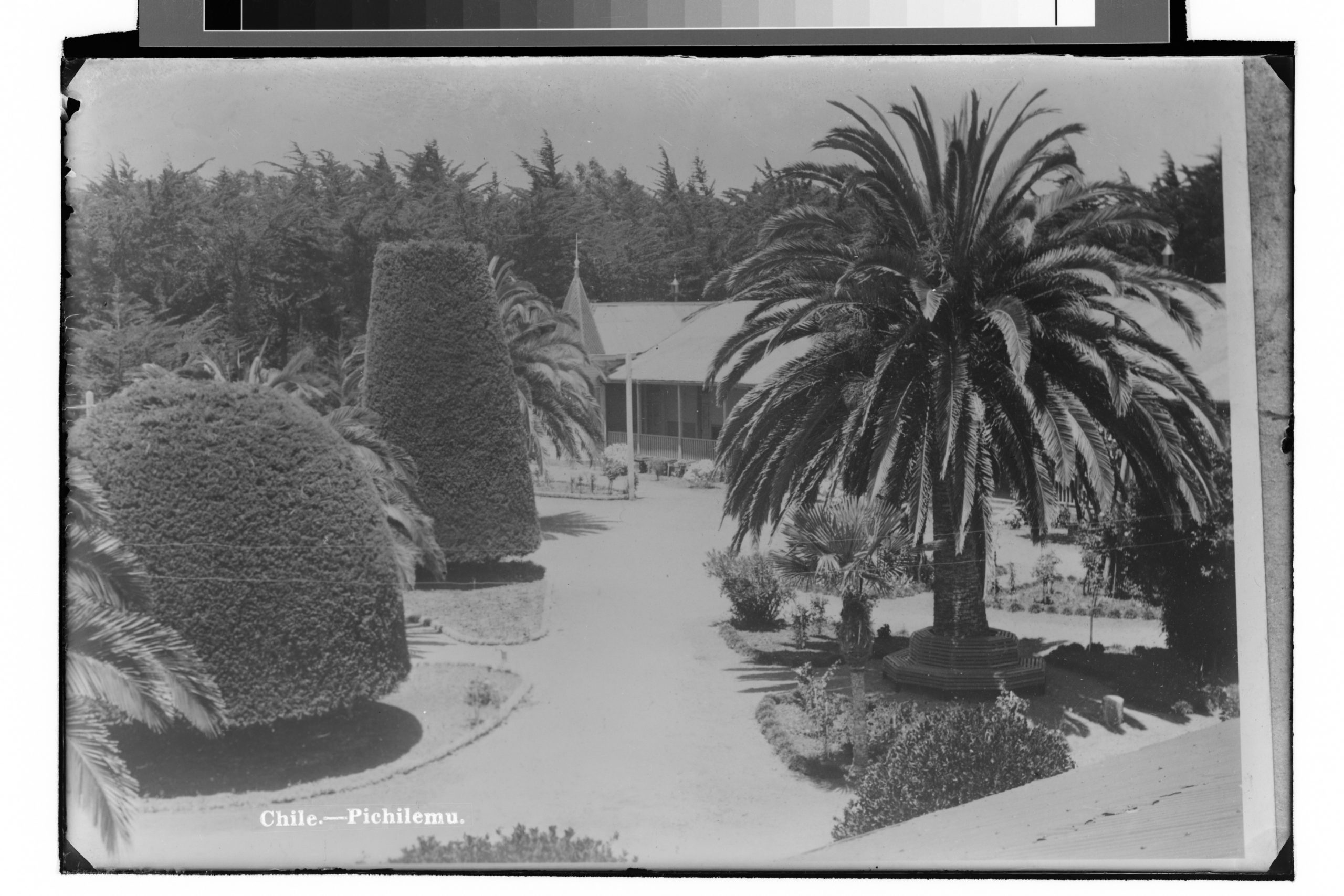 Vista de una plaza cerrada con rejas y una fuente con una columna en su centro.