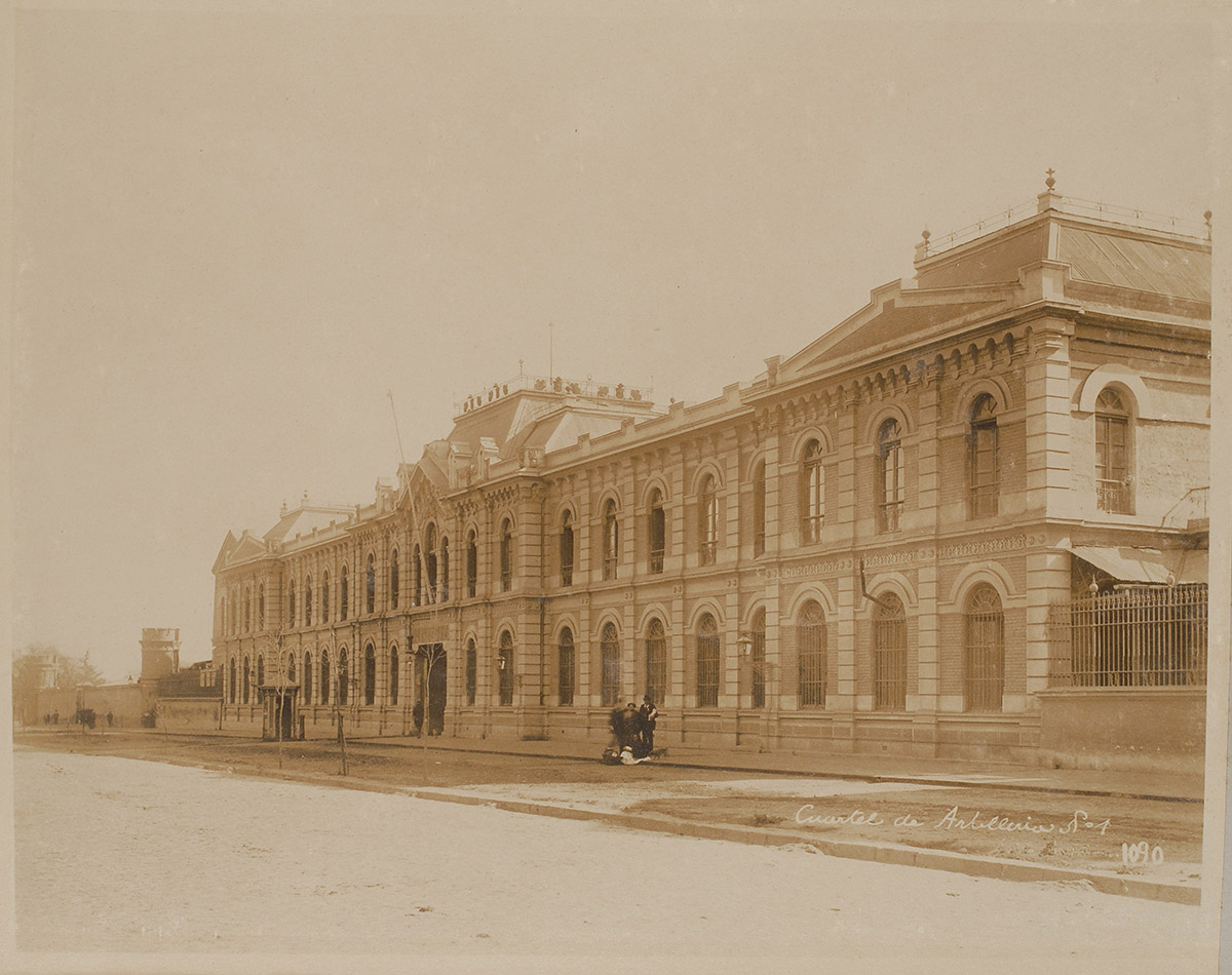 Vista de un edificio de dos pisos de tipo neoclásico. Sentada sobre la vereda se ve una mujer con hombres parados detrás de ella.
