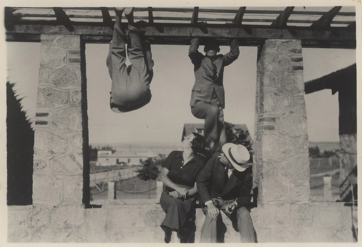 Retrato de dos niñas chicas de pie con el mismo vestido negro. La más chica apoya su cabeza sobre el hombro de la más grande.