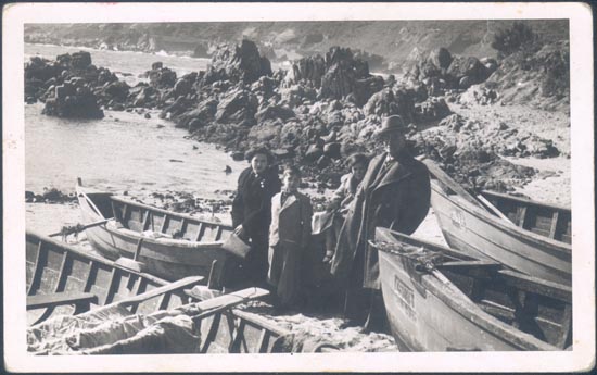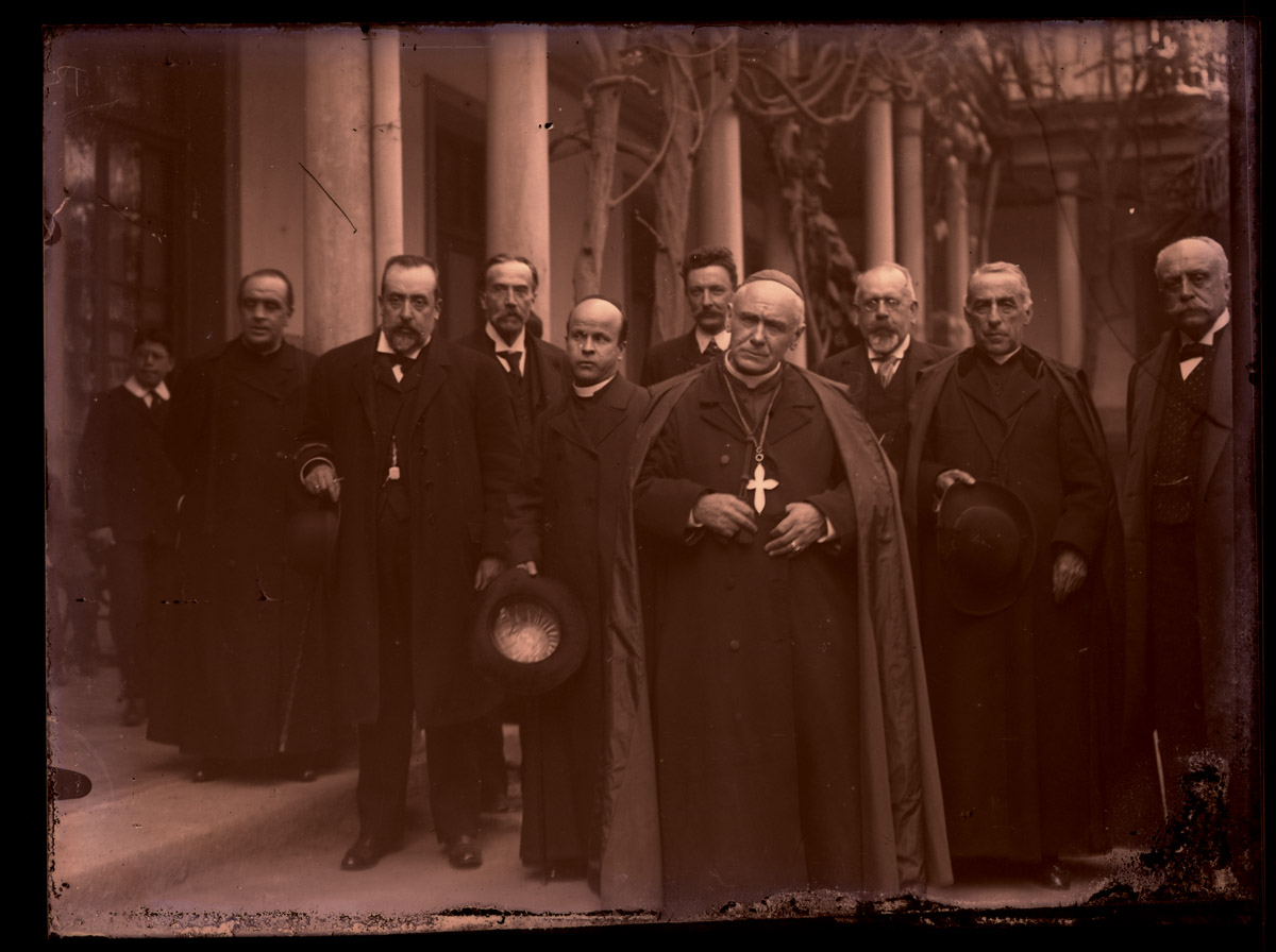 Un sacerdote se encuentra de pie rodeado de varios hombres de traje en el patio de un edificio.