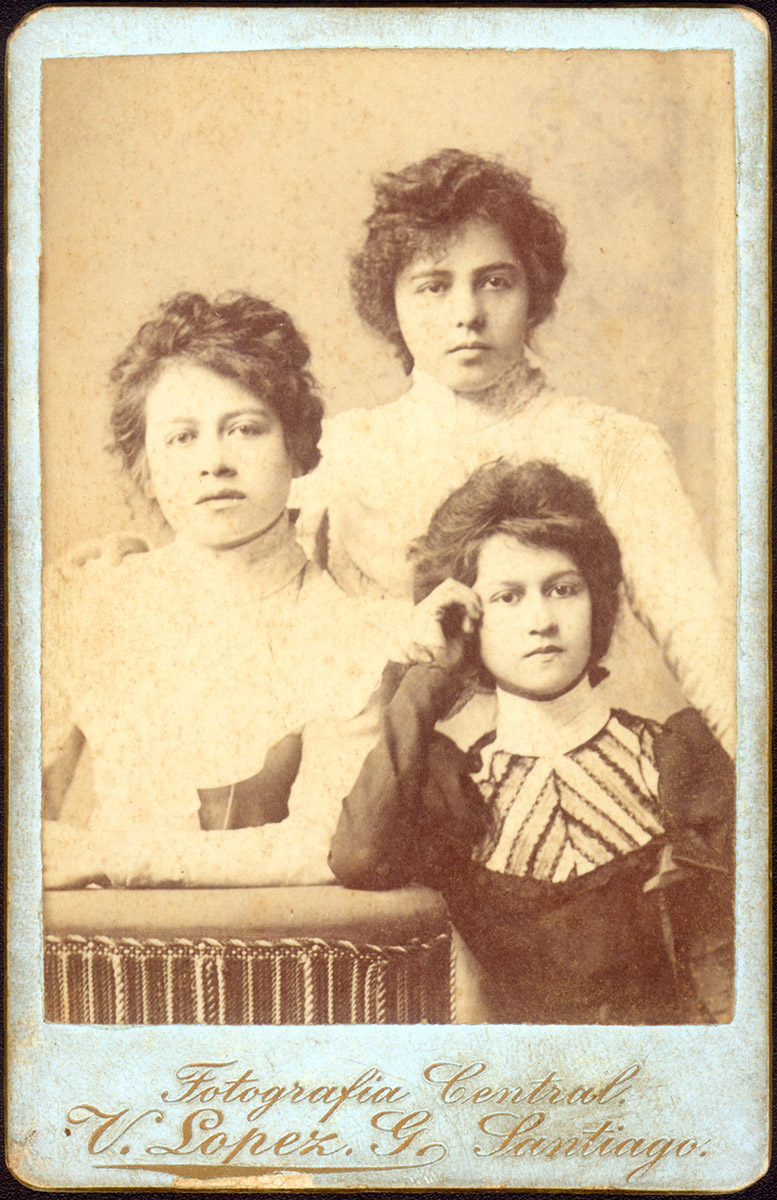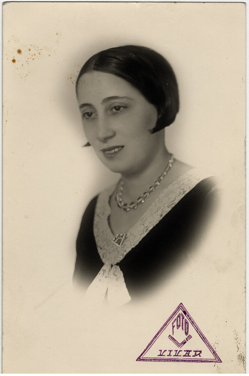 Mujer con un vestido blanco con cuello, aros de perla. Tiene el pelo tomado, y está en una posición lateral.