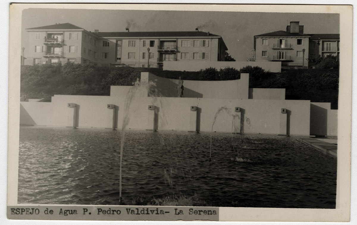 Vista de una fuente con chorros de agua, con edificios en segundo plano.