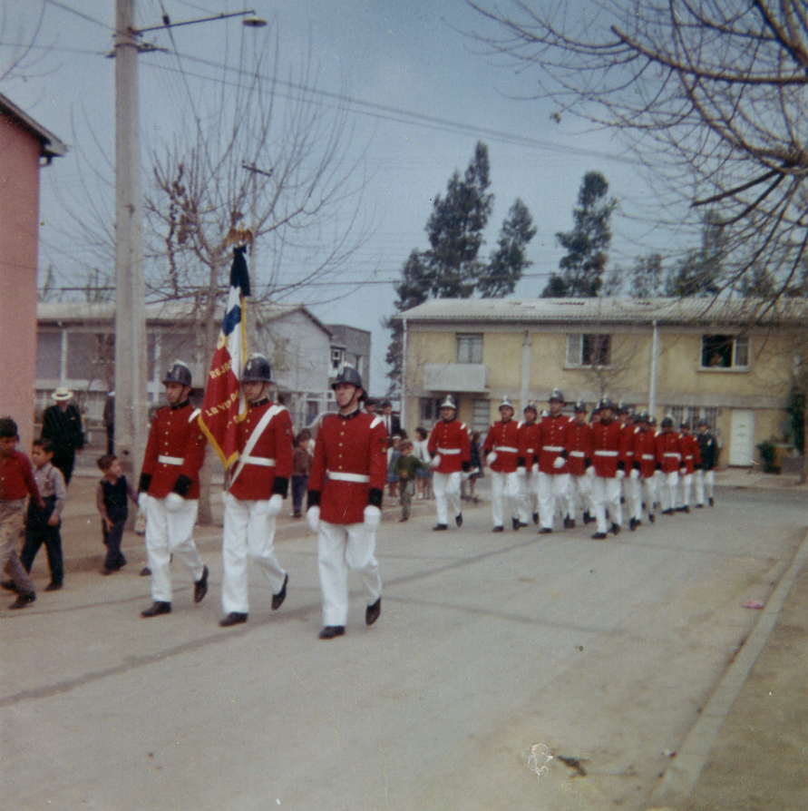 Un grupo de personas, entre adultos y niños, se encuentran al aire libre. Destaca una pareja bailando a la derecha de la imagen. De fondo, un volcán cubierto completamente de nieve.