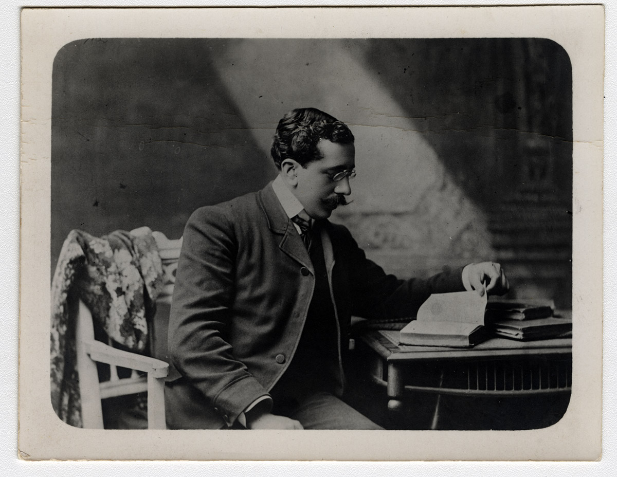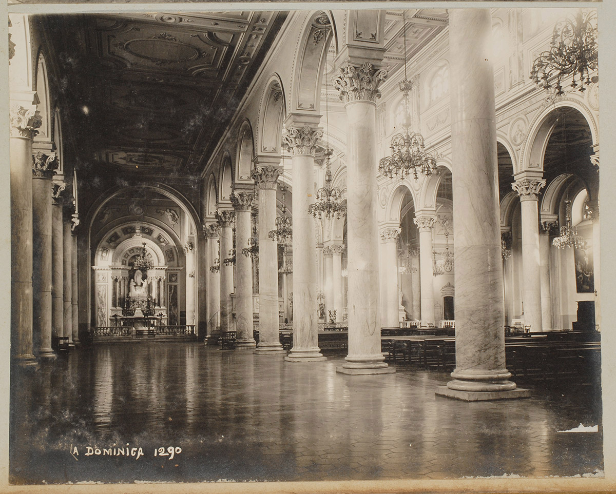 Familia compuesta por los padres y un hijo está posando al lado de un pilar rodeada por palomas. En segundo plano, se ve el pórtico de una iglesia.