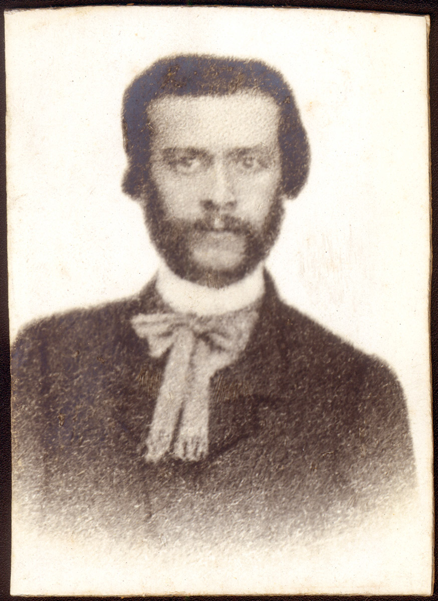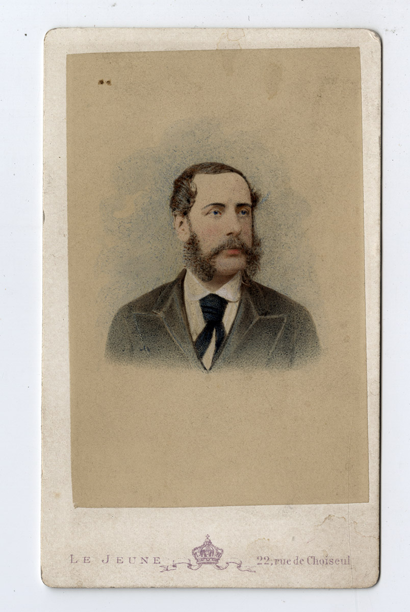 Familia compuesta por una mujer, un hombre y dos niños está sentada alrededor de una mesa tomando el té. Atrás del grupo se ve un mesero pasando con una bandeja.