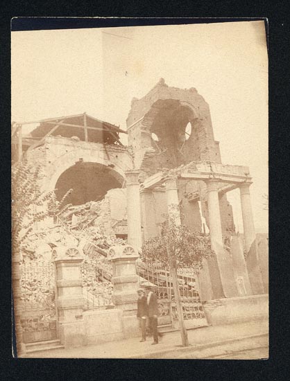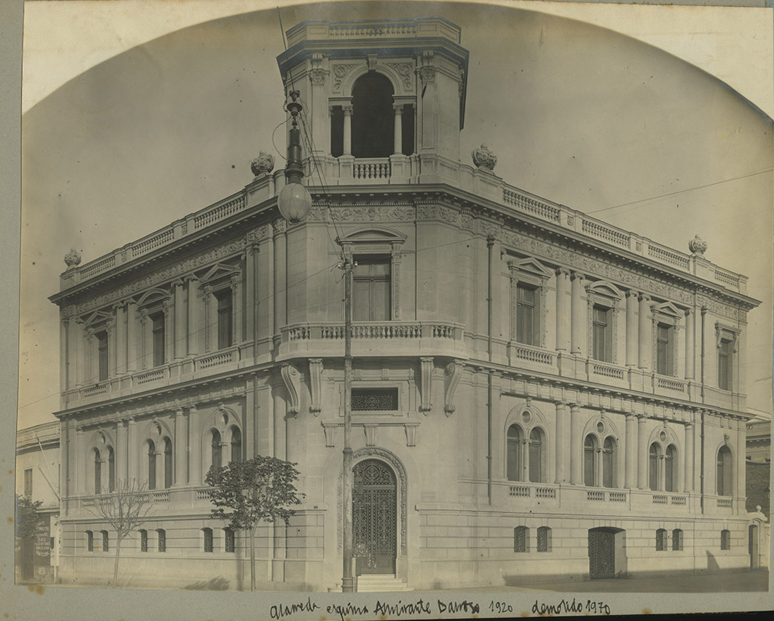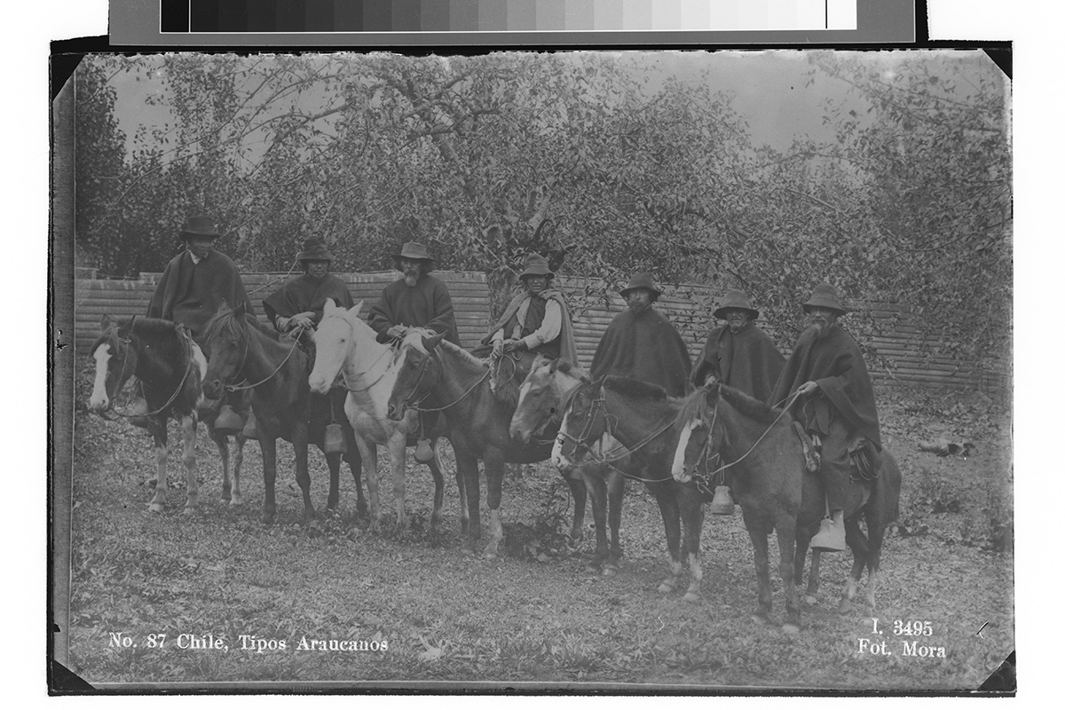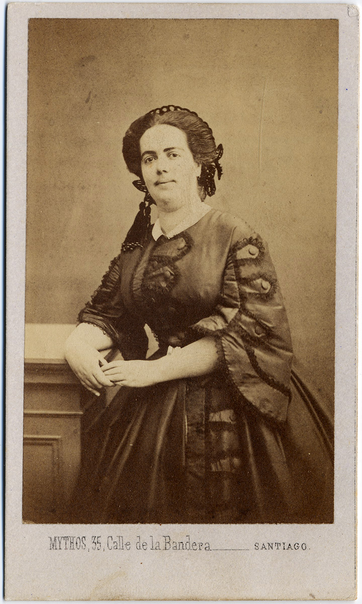 Retrato de grupo compuesto de seis mujeres, cuatro hombres y cuatro niños, algunos de pie y otros sentados sobre una silla y en el suelo. Se encuentran en el patio de una casa con una reja y plantas detrás.