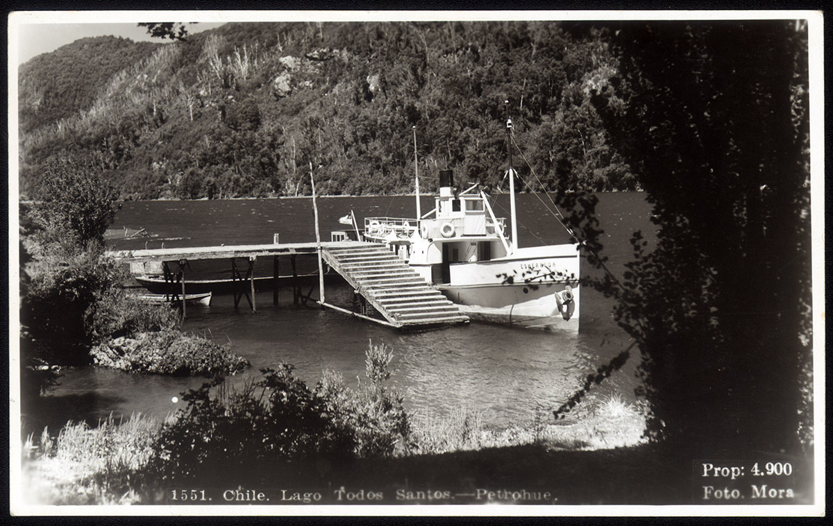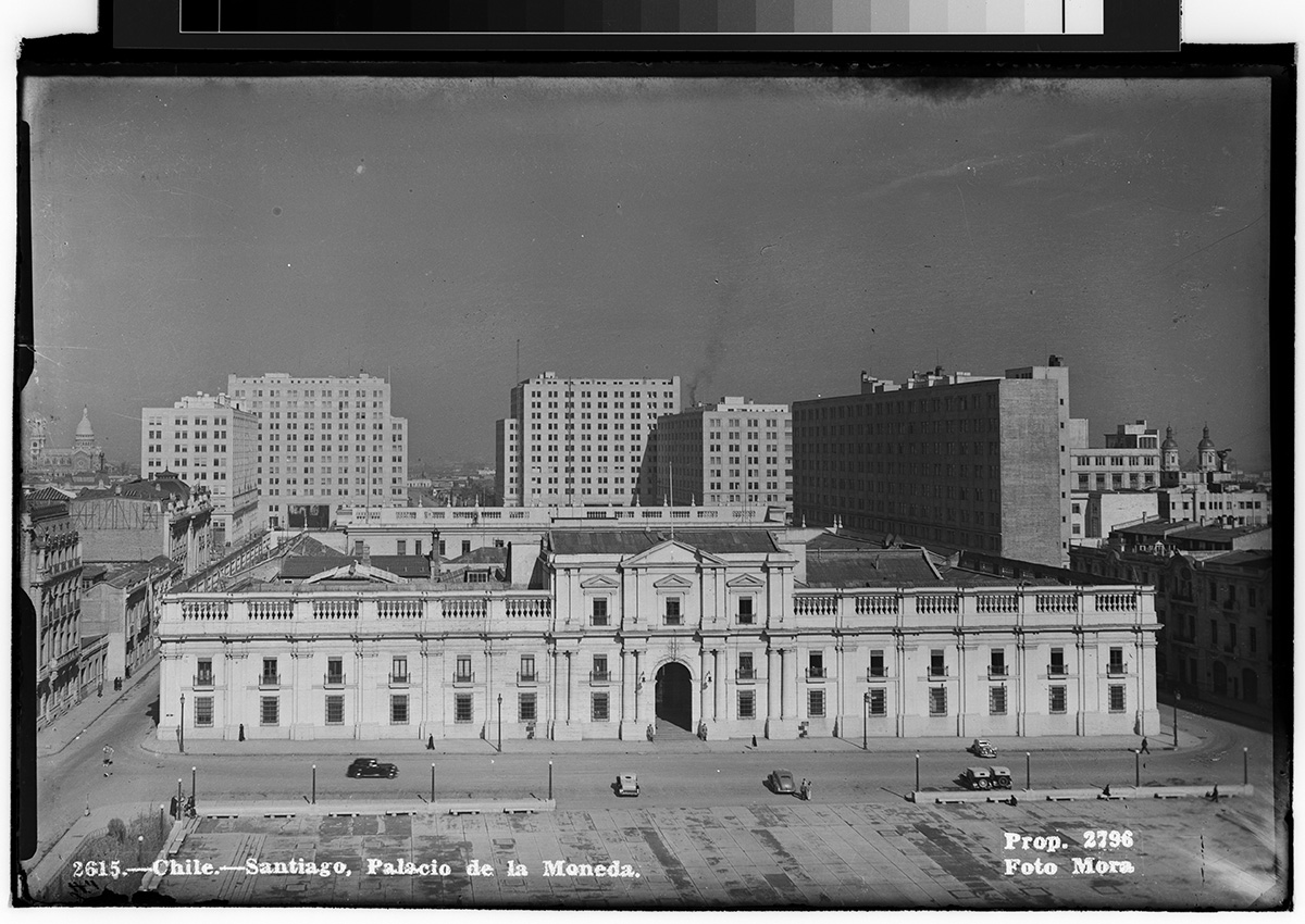Una gran cantidad de personas posan para la fotografía, rodeando un espejo de agua en el jardín exterior. Se identifica la bandera de la Confederación de Trabajadores de Chile y a tres personas: Elias Lafertte, Presidente del Partido Comunista de Chile; Salvador Ocampo, Subsecretario General de la Confederación de Trabajadores de Chile y Vicente Lombardo Toledano, Presidente de la Confederación de Trabajadores de América Latina.