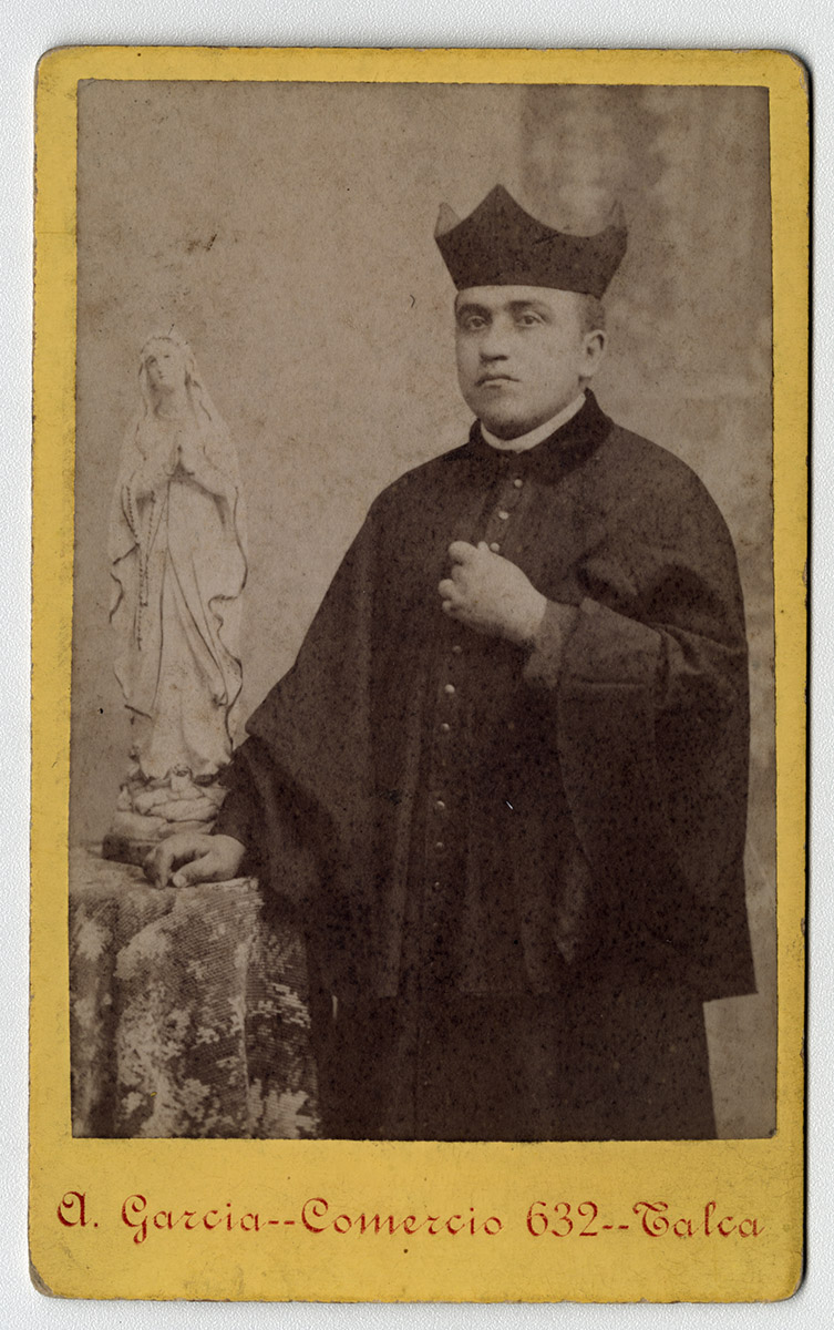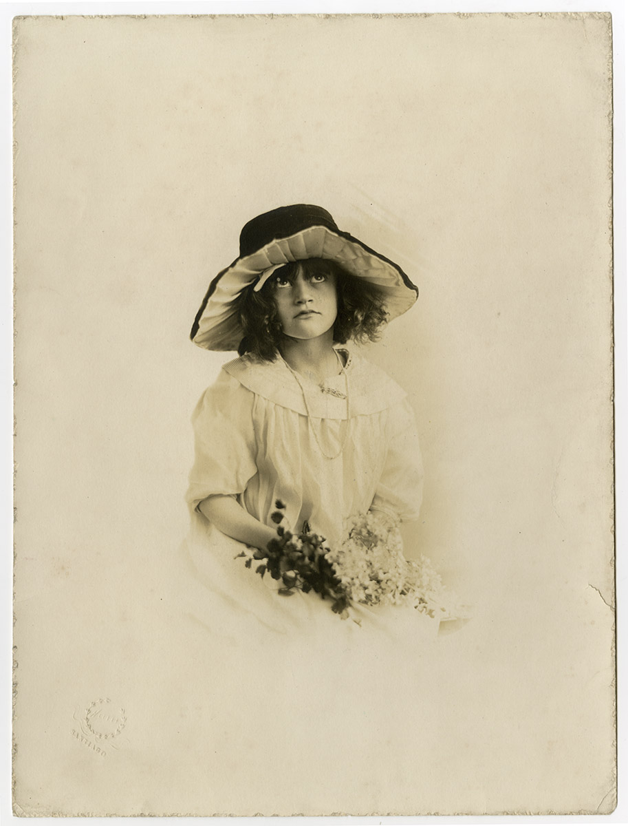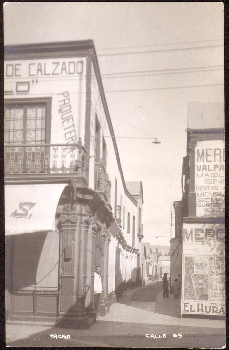 Vista de un edificio de tres pisos rematado con mansardas y con una bandera colgada. Dos hombres están hablando delante la entrada y dos niños están mirando hacia la cámara.