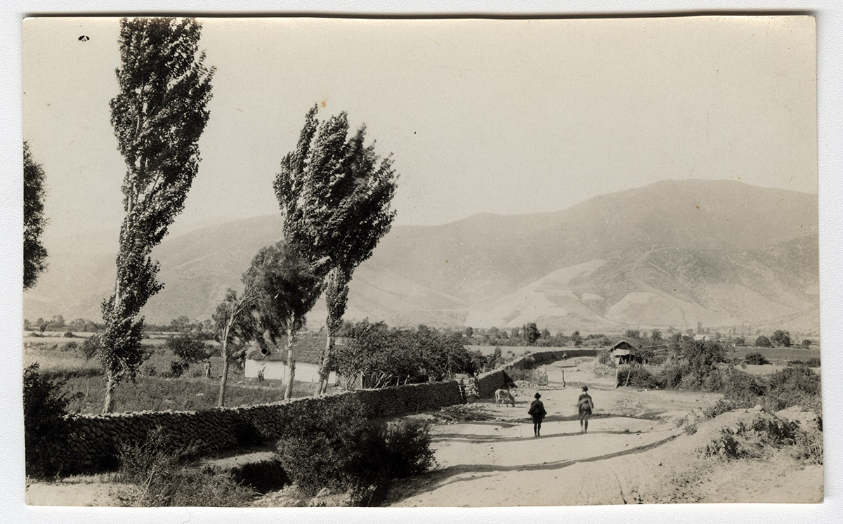 Vista de una iglesia, su jardín delantero y de otros edificios, dentro de un recinto cerrado. En la parte inferior izquierda de la imagen se ve un grupo de personas posando.