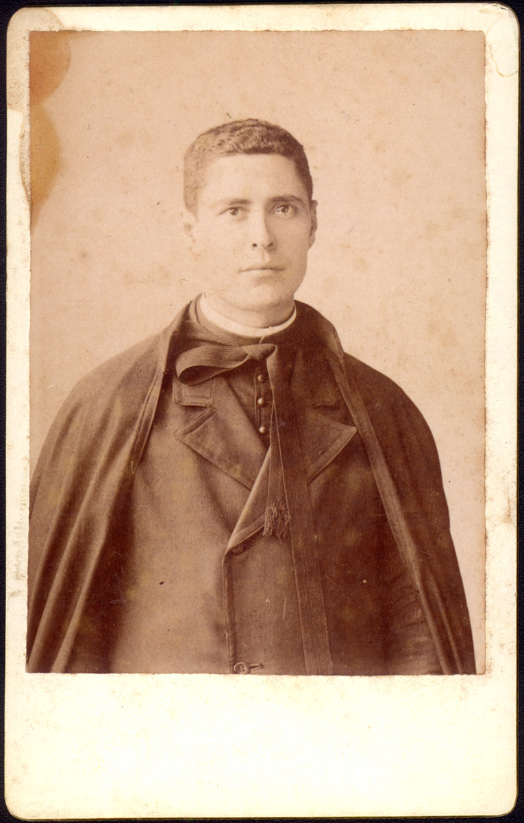 Edificio de tres pisos a la esquina entre dos calles. Un vendedor de diario está parado delante.