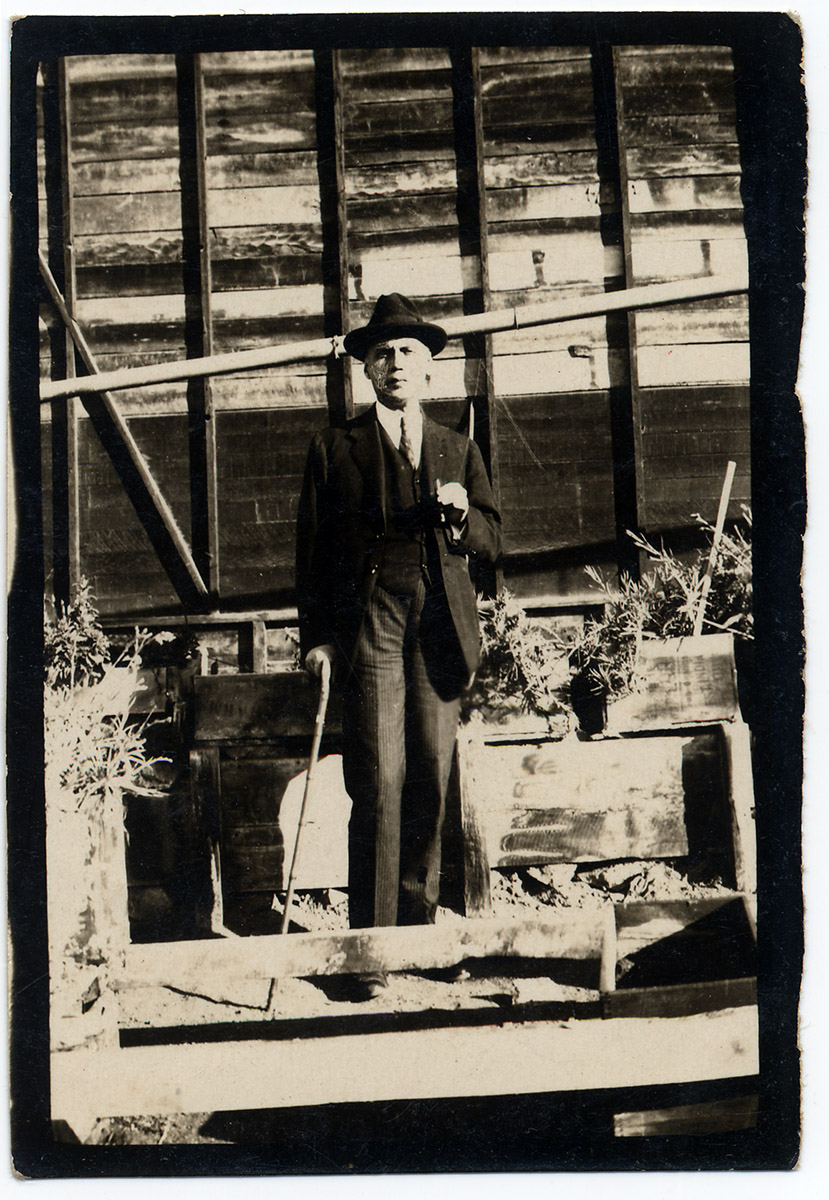 Niño con overol de pie en una calle cerca de un árbol con una escopeta en su mano. Tiene los brazos caídos y las piernas juntas, en una posición marcial.