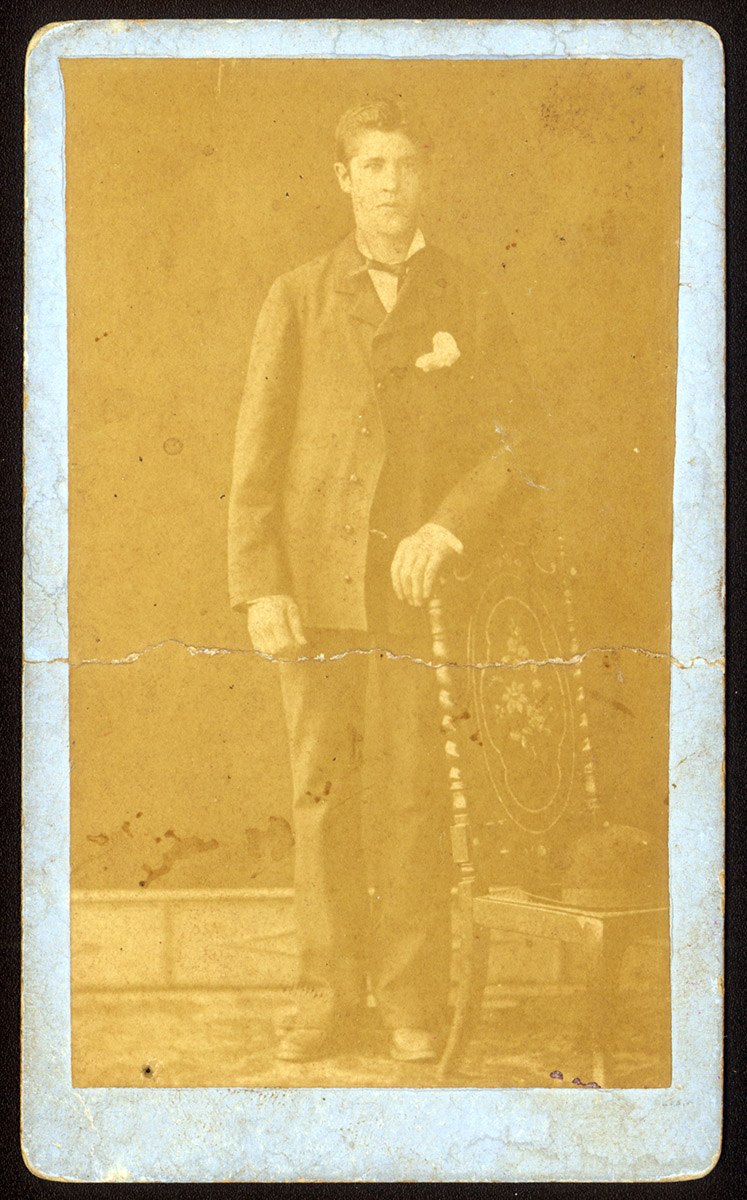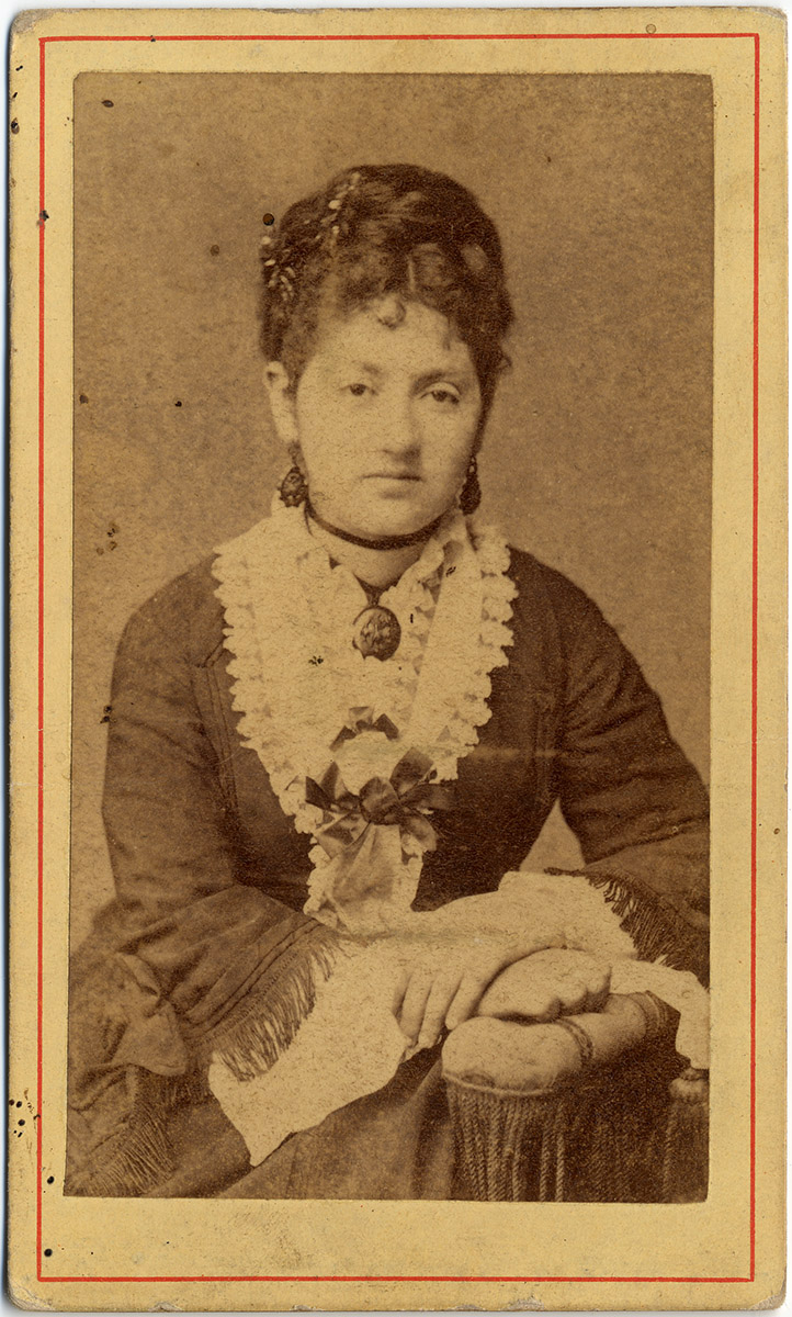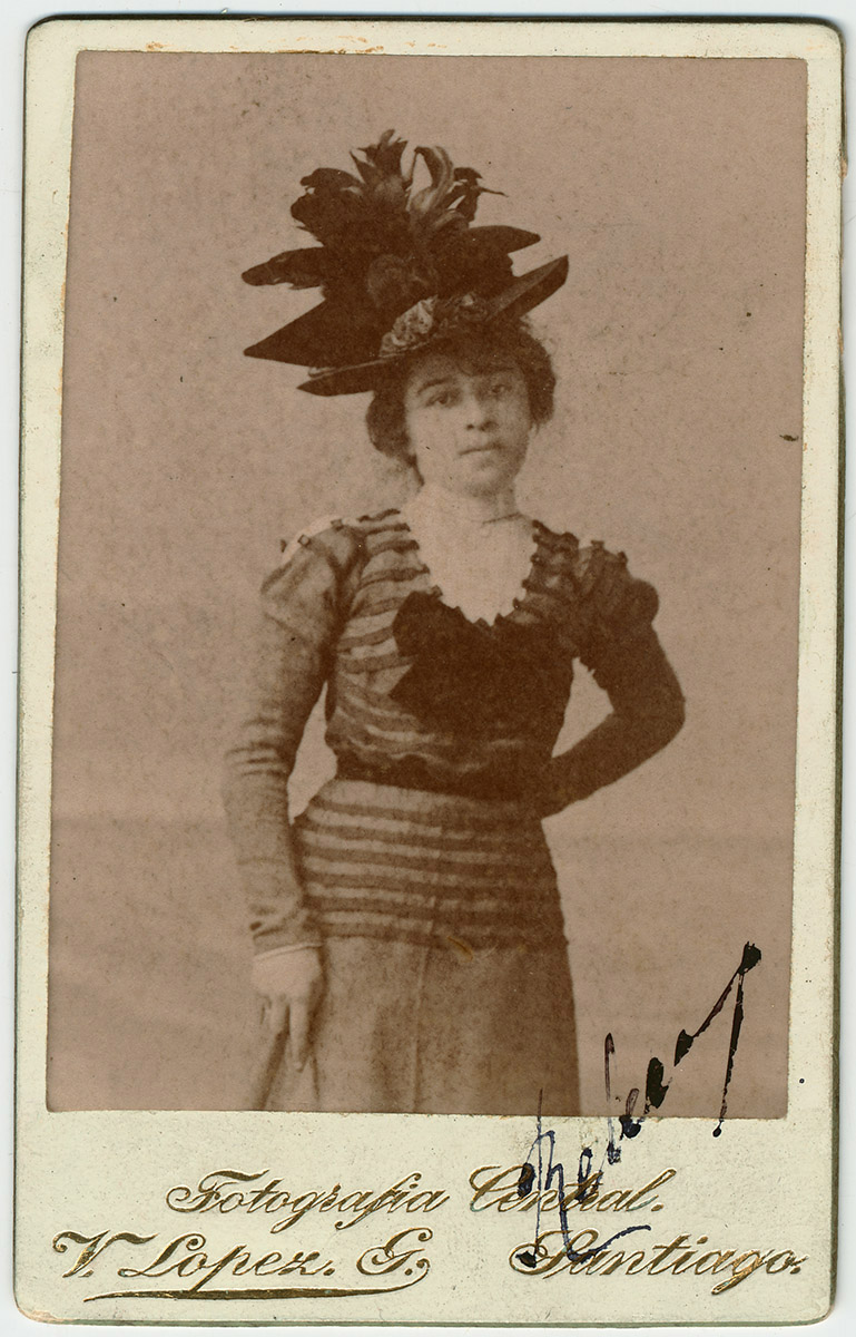 Una mujer de pie apoyada en una mesa y con una ramo de flores en una mano