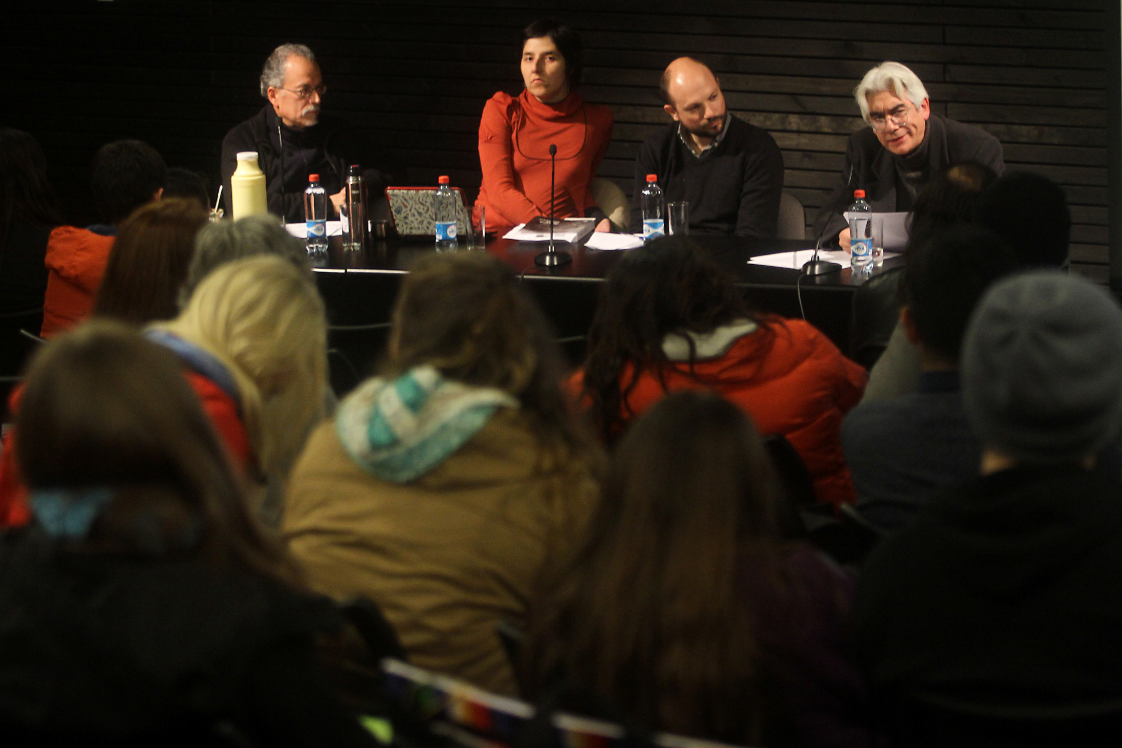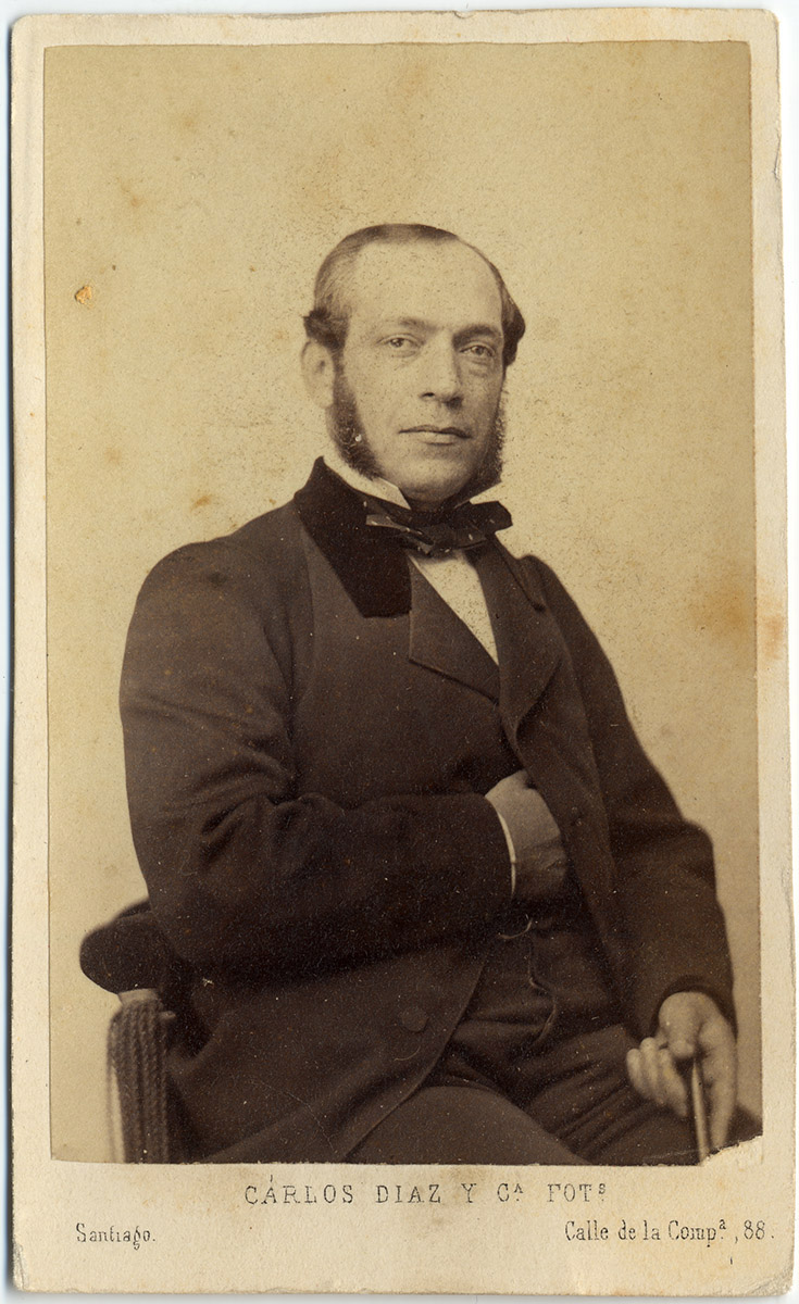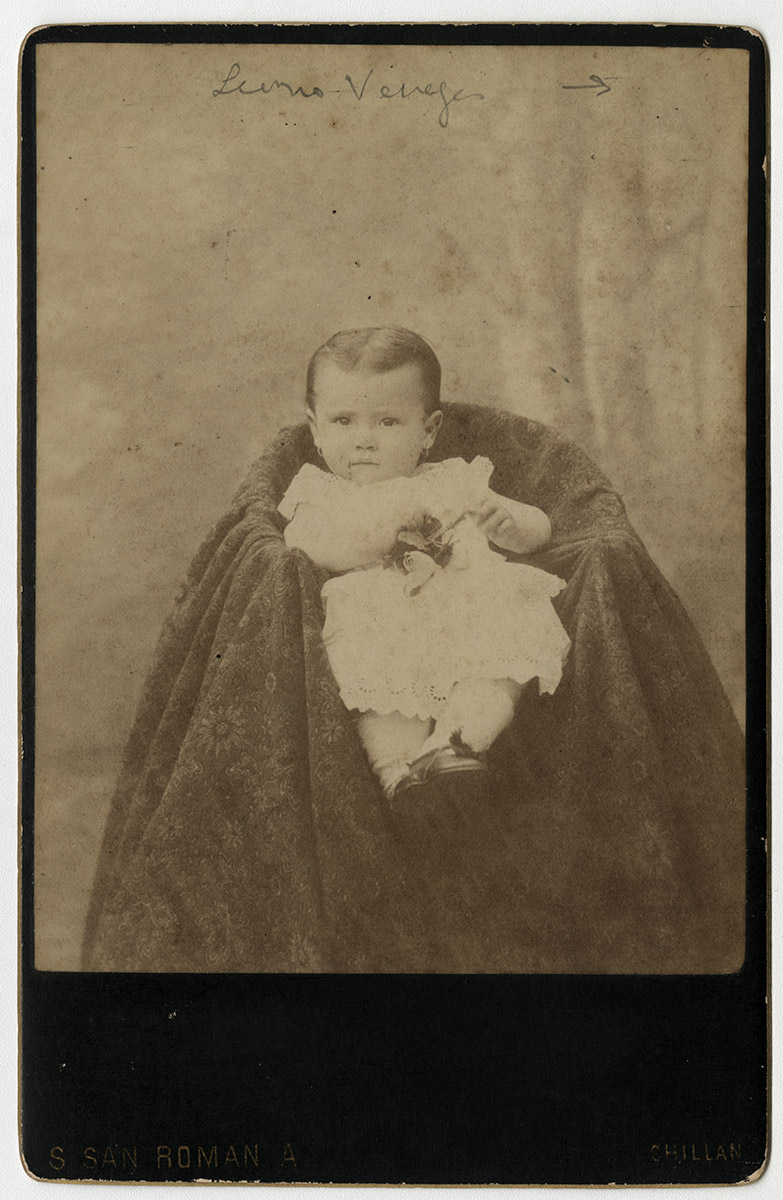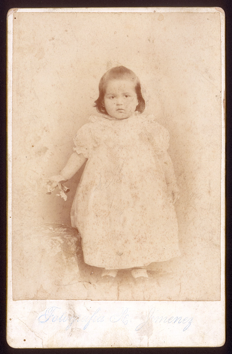 Retrato de una mujer con chaqueta blanca que se encuentra junto a un comedor de madera. A su lado, de pie, se encuentra una niña con vestido negro. Al lado de la niña, sentado sobre una silla, se encuentra sentado un niño.