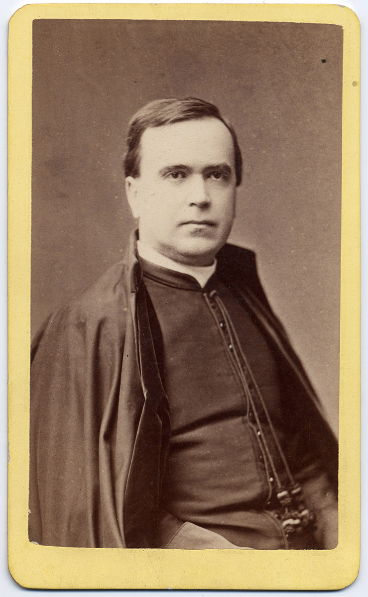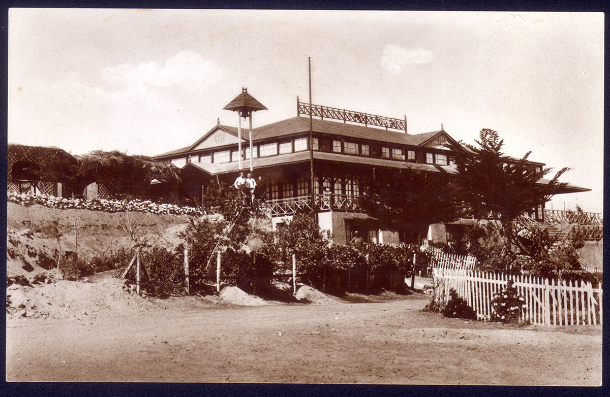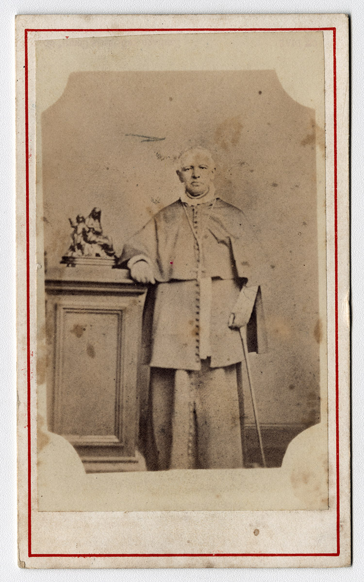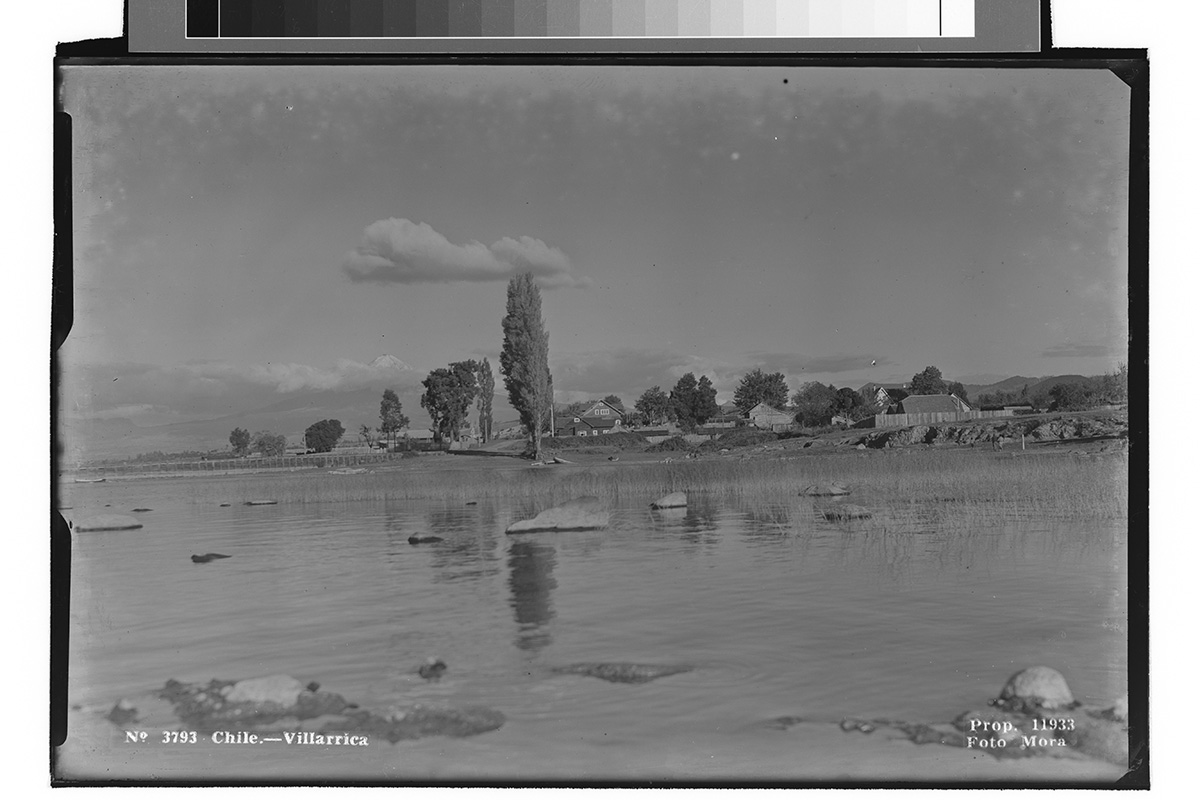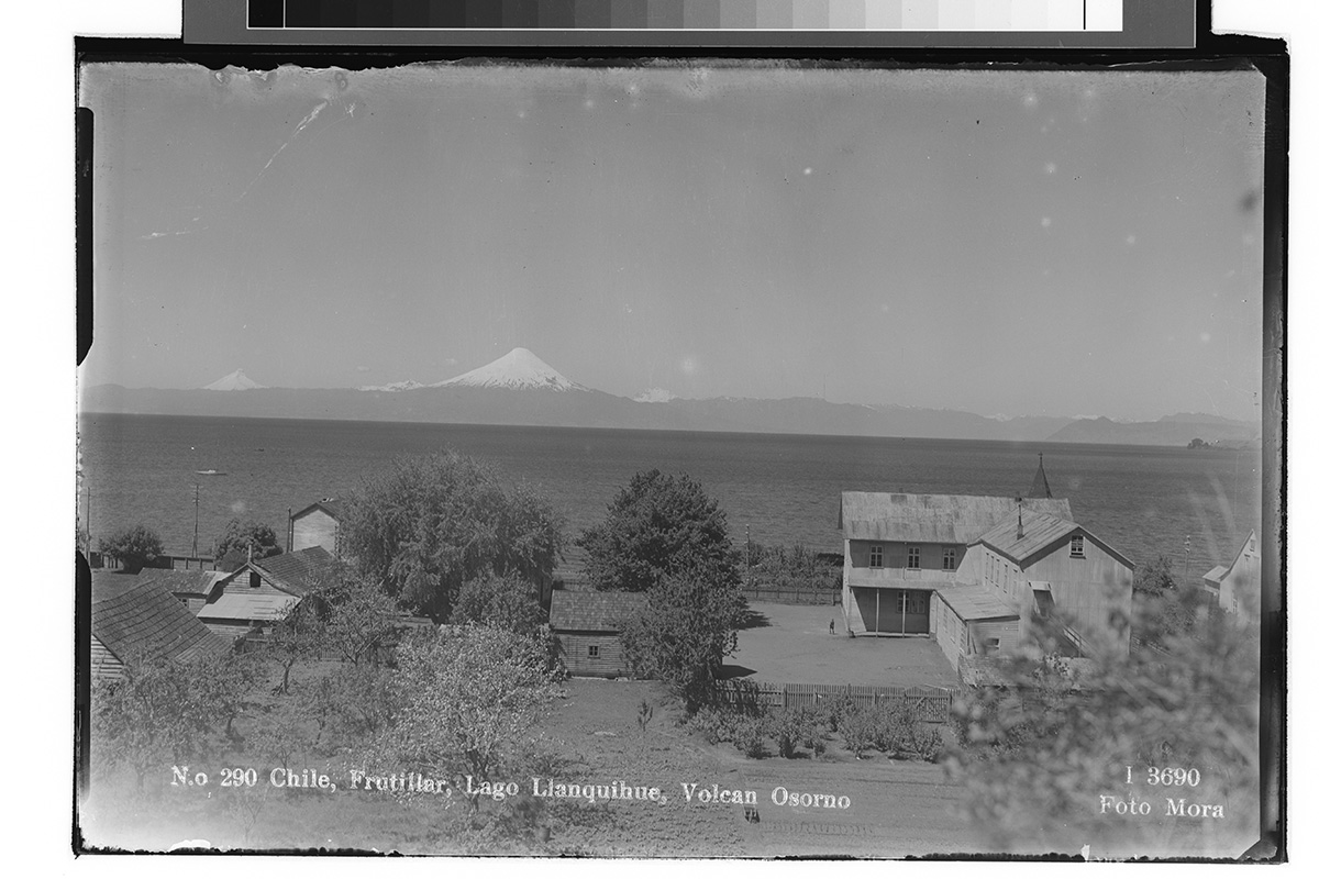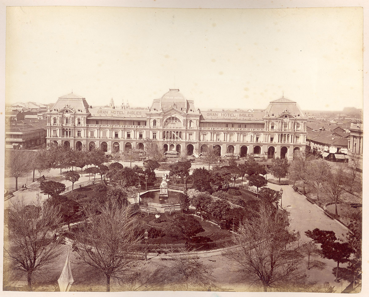 Retrato de una mujer de vestido oscuro, cartera en las manos y sombrero de pie en una jardín. A su lados se encuentran una niña con vestido blanco y una cinta en el pelo, y un niño con uniforme de marinero.