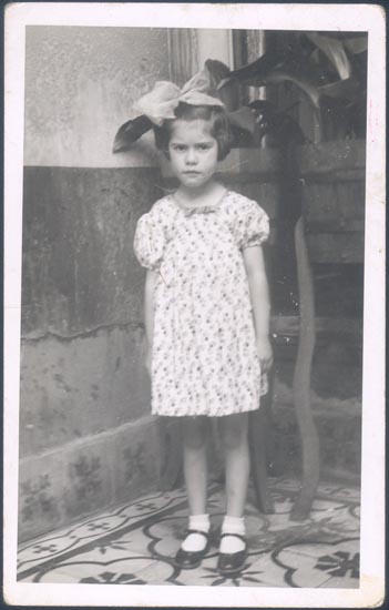 Plano medio de una mujer con un vestido blanco con decoración de cristales. Entre sus brazos reposa un pitillo o tela clara traslucida. En su brazo derecho cuelgan varias joyas. Lleva aros de perlas y su pelo corto.