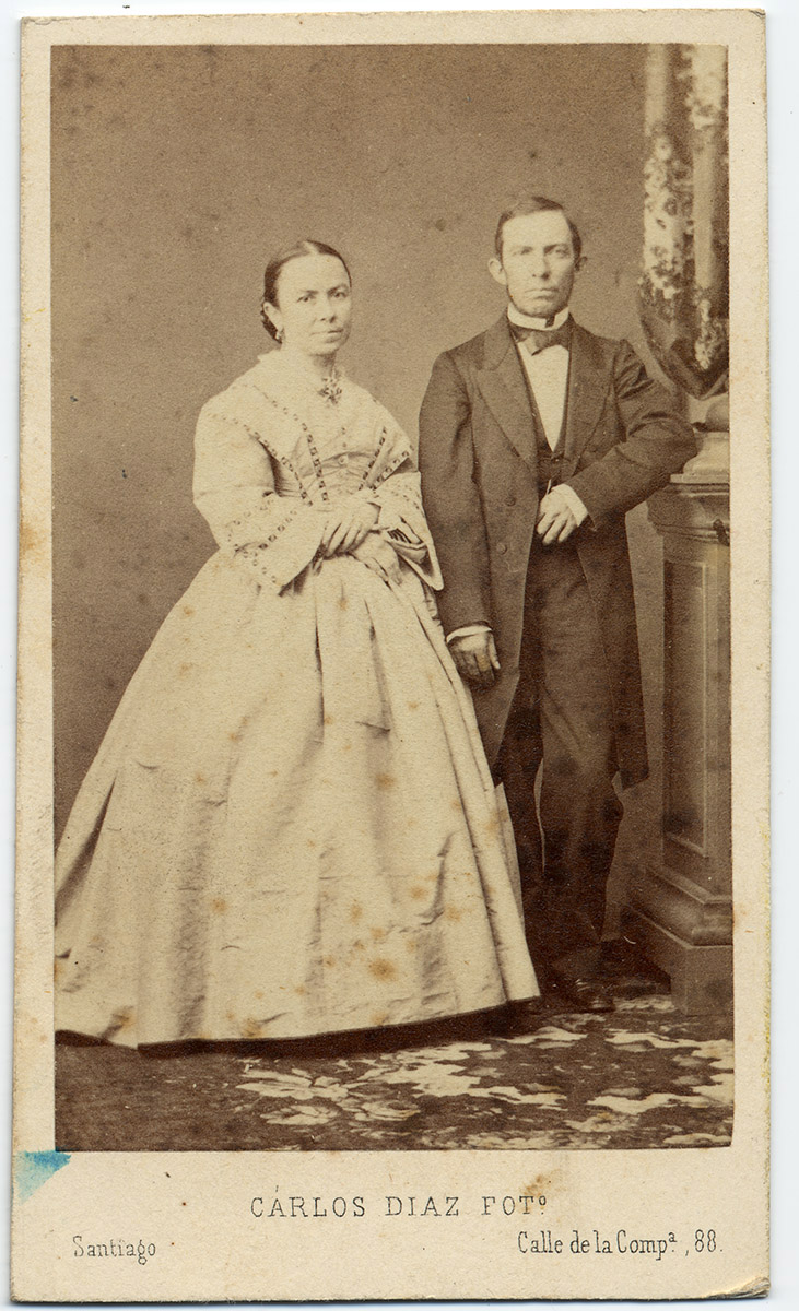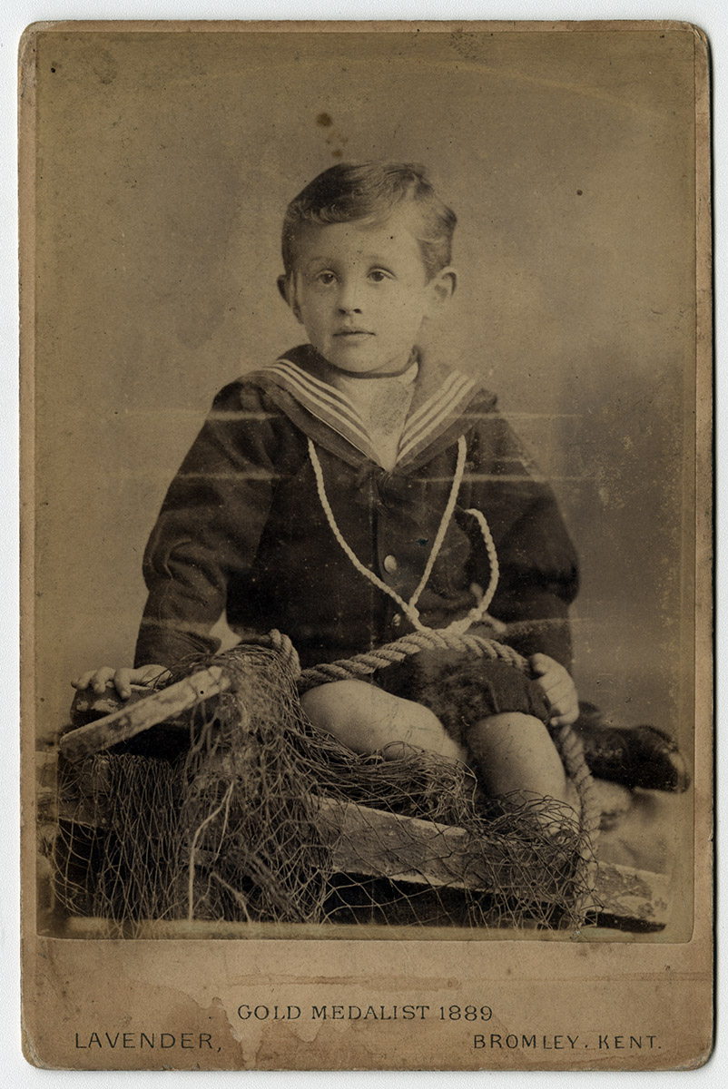 Retrato de pie de un niño vestido elegante, apoyado en una mesa.