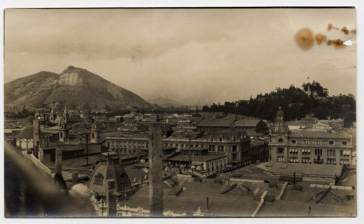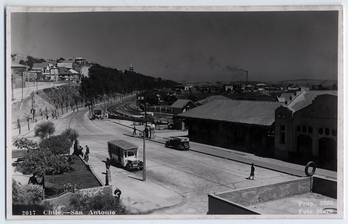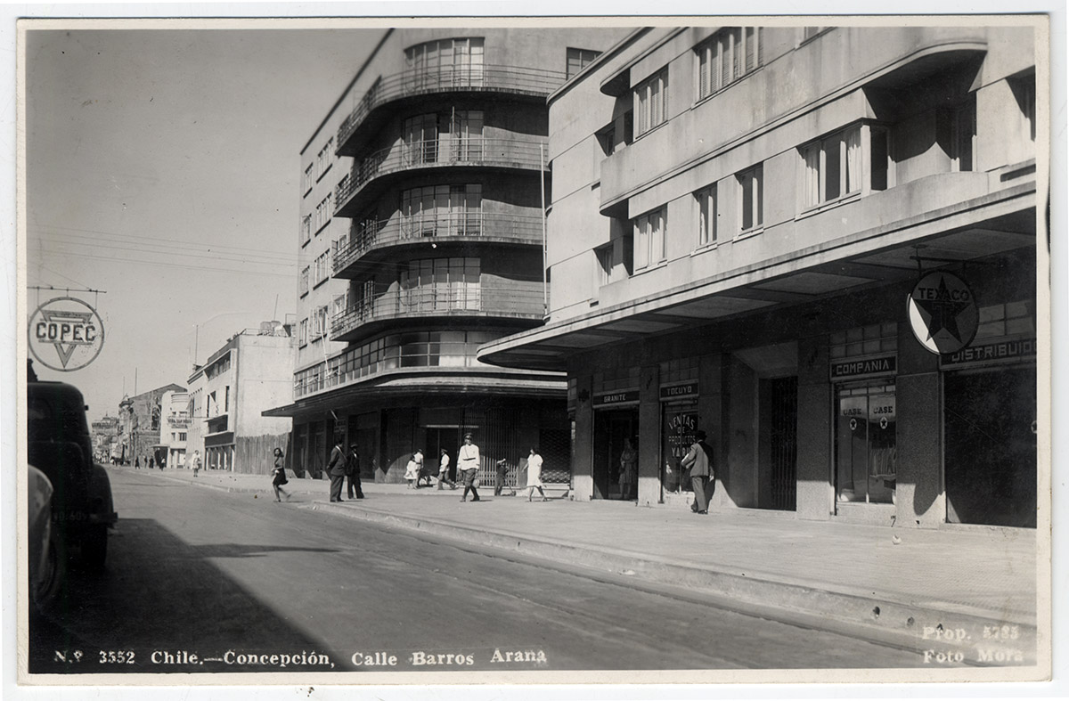 Panorámica diagonal calle pavimentada, construcción cuatro pisos en primer plano, diferentes alturas hacia el fondo. Comercio en el primer piso directo a la calle, personas caminando en las veredas, automóviles detenidos en la calle, una carreta detenida con un hombre al frente de pie.
