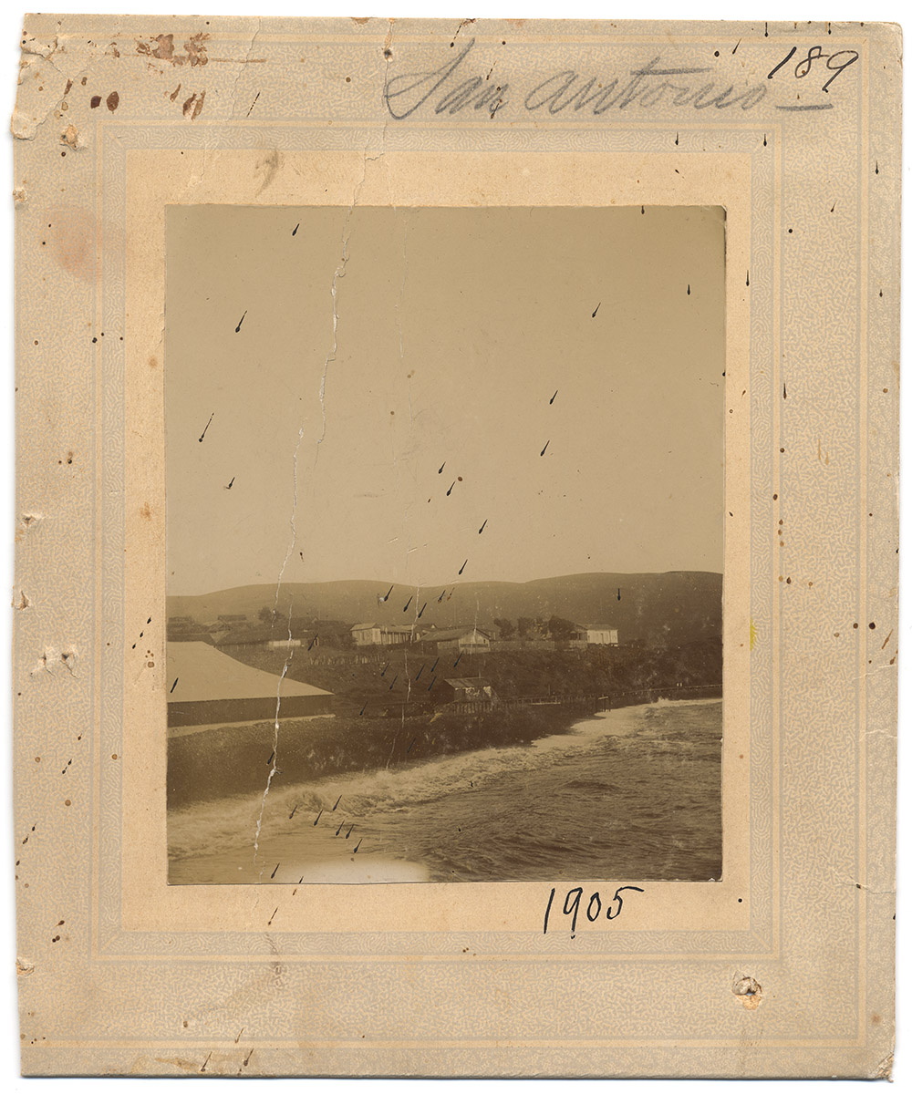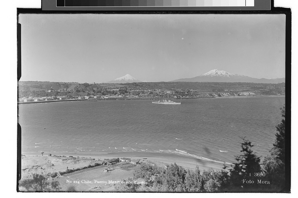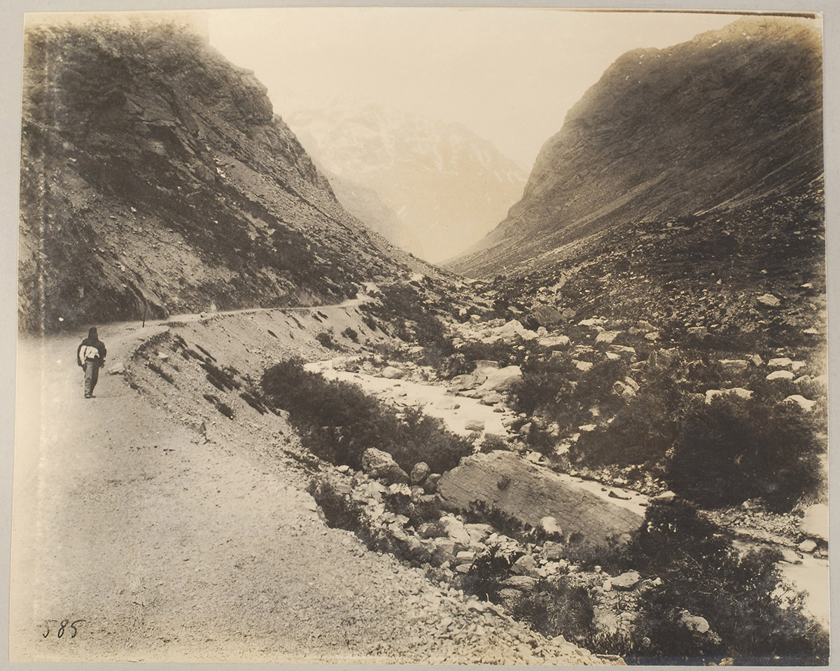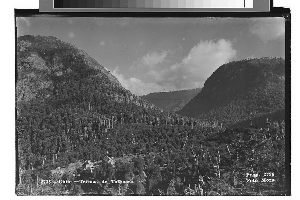Vista en altura, caída de agua a la derecha, rodeado de bosque, de fondo cordón montañoso, con tres cimas nevadas.