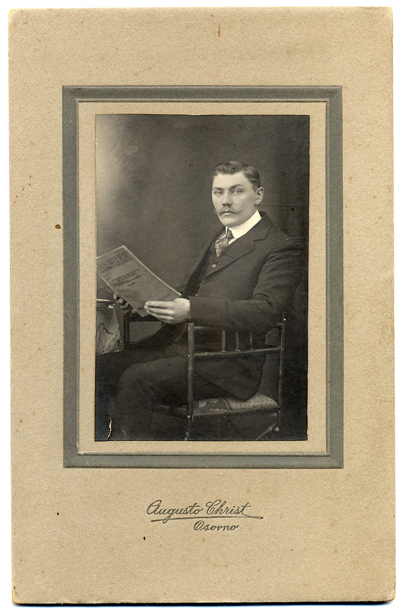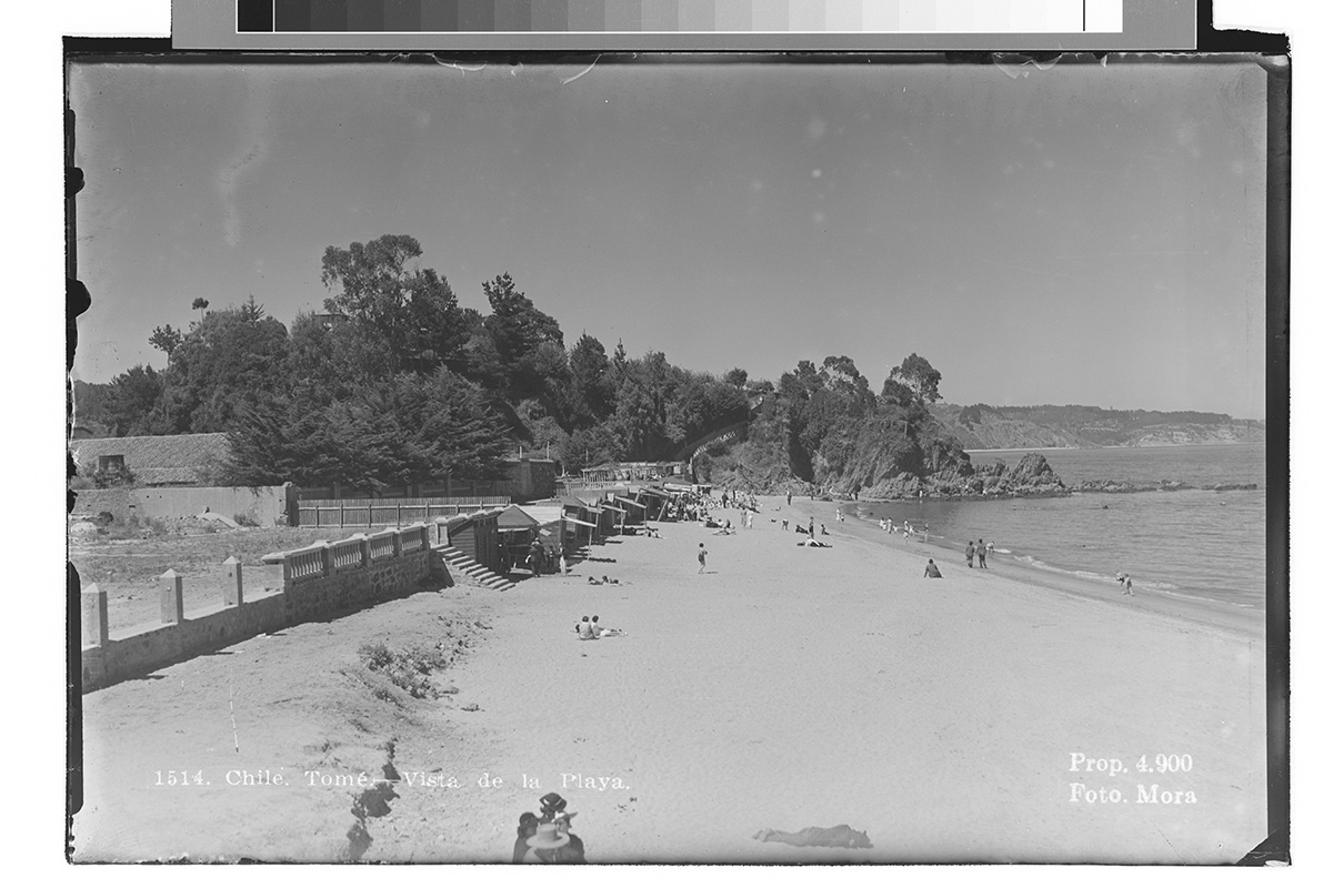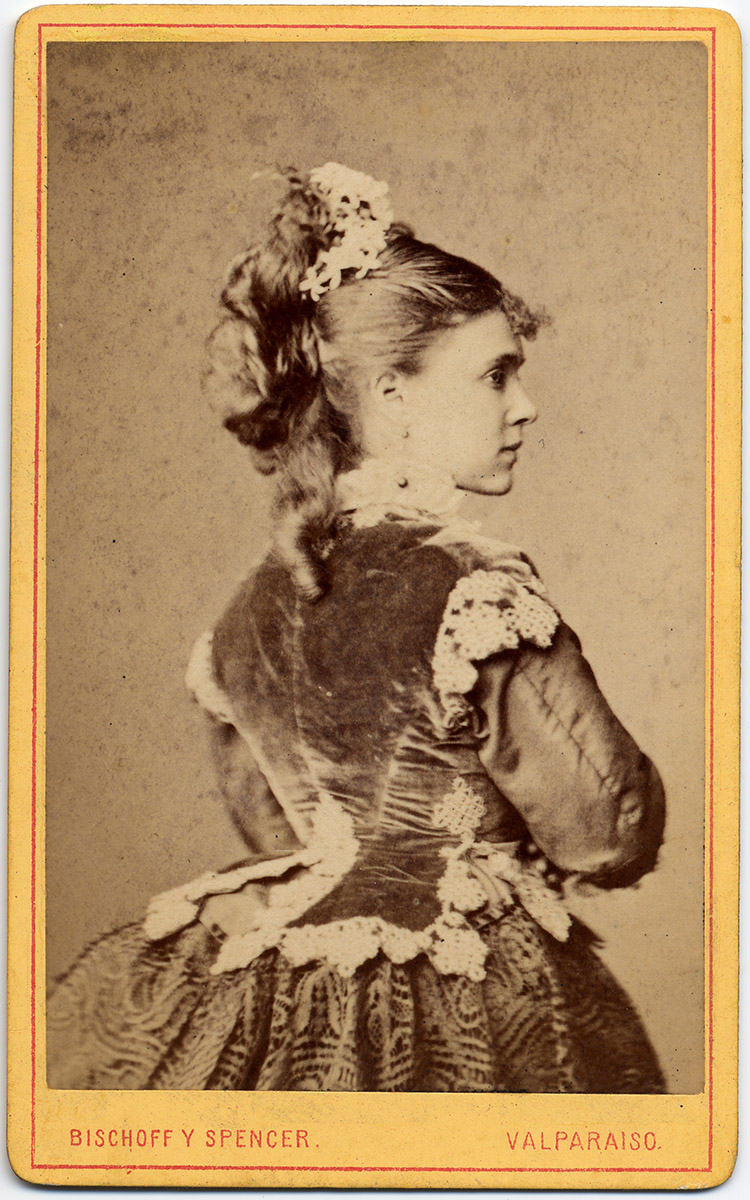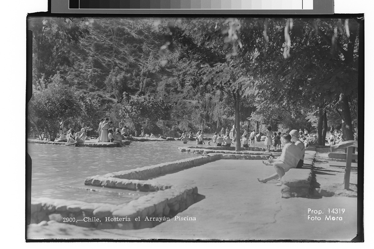 Vista en altura, caída de agua a la derecha, rodeado de bosque, de fondo cordón montañoso, con tres cimas nevadas.