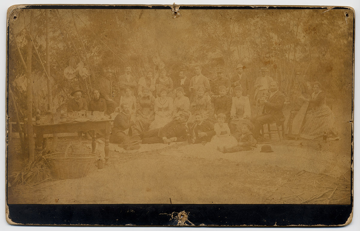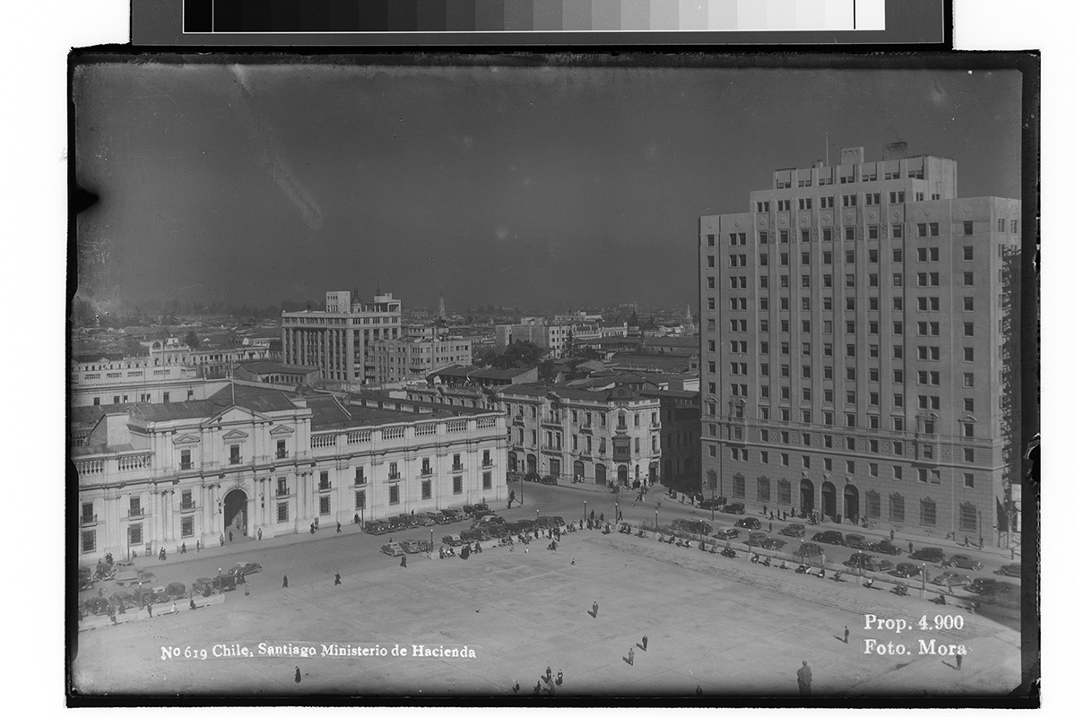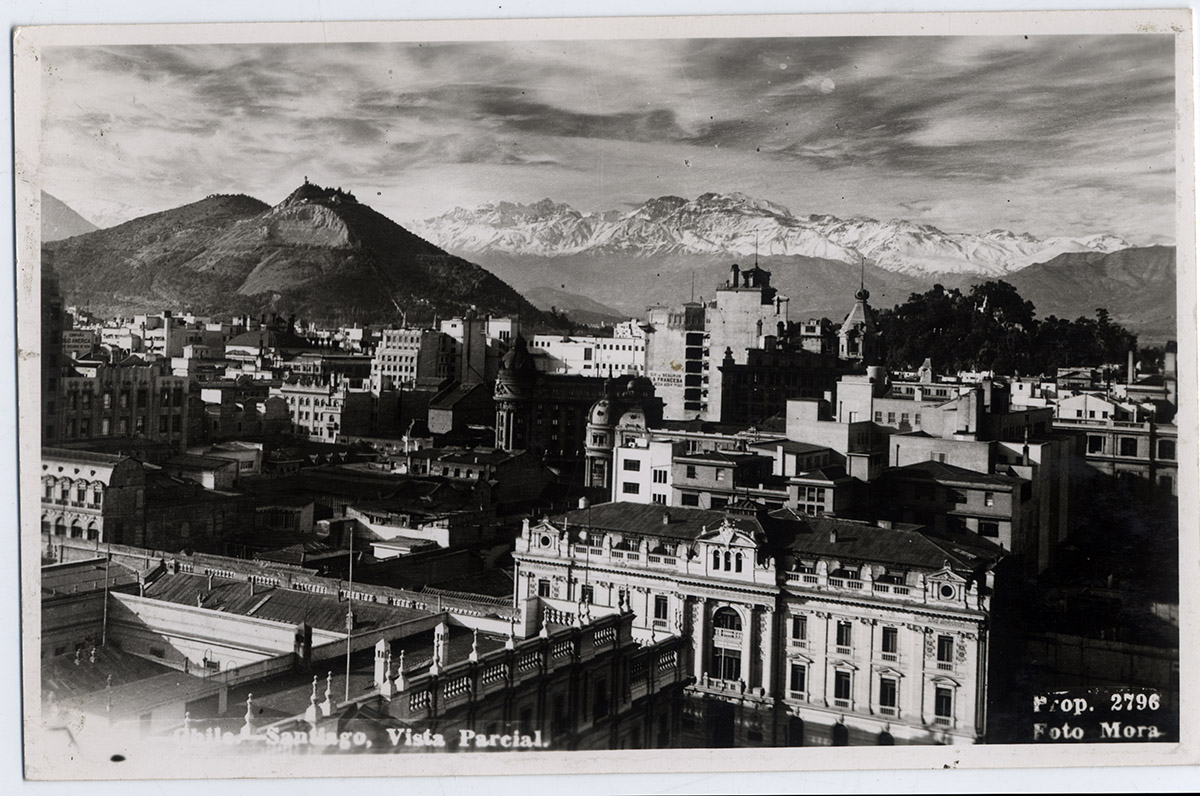 Panorámica altura ciudad, grandes copas de árboles en primer plano, en segundo construcciones diferentes tamaños. Cerros de fondo