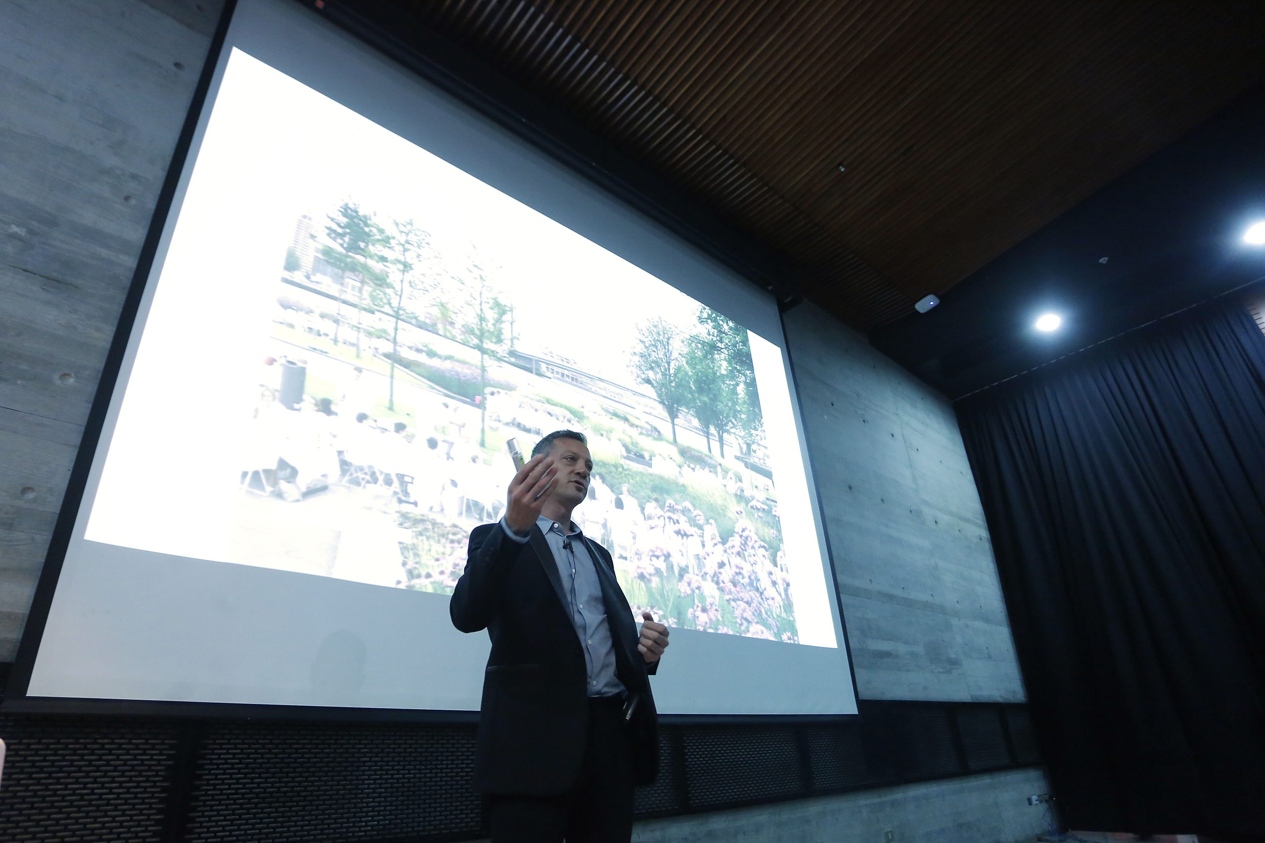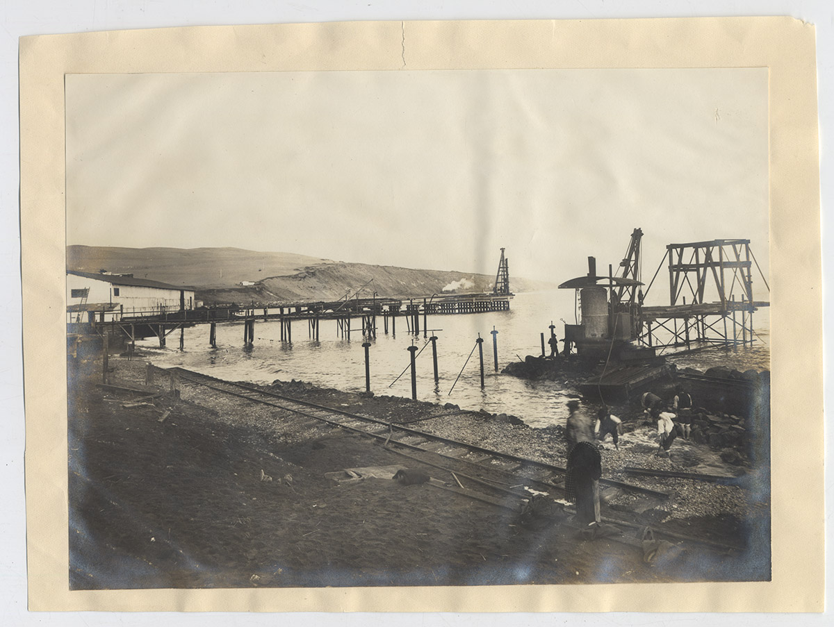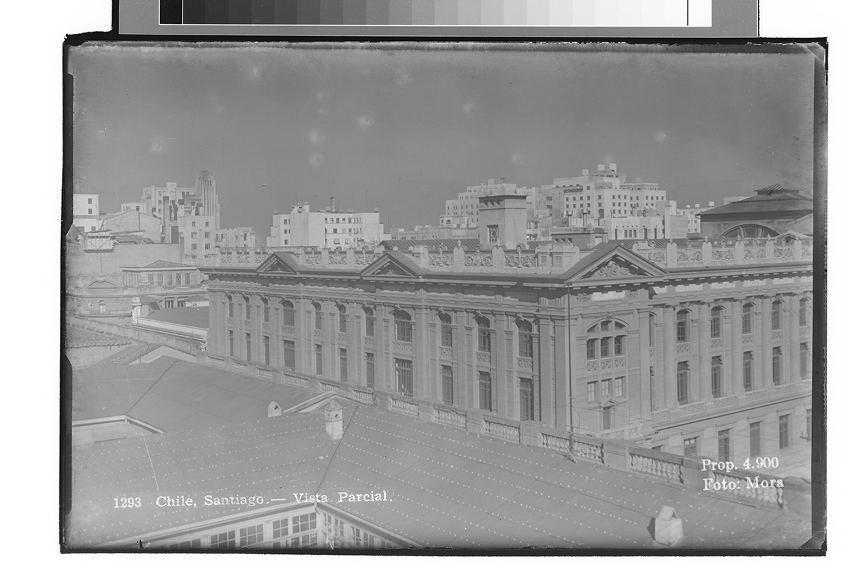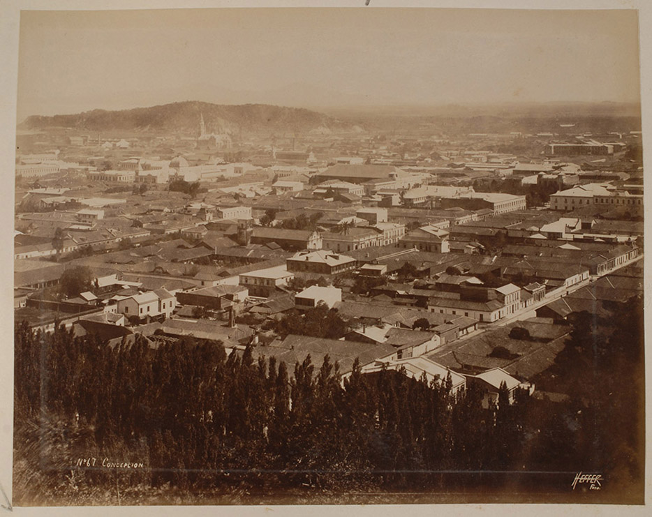 Panorámica en altura, ramas de árbol como marco superior, cerca de madera al costado de un sendero. Construcciones de madera y el Rio en segundo plano. La ciudad de fondo
