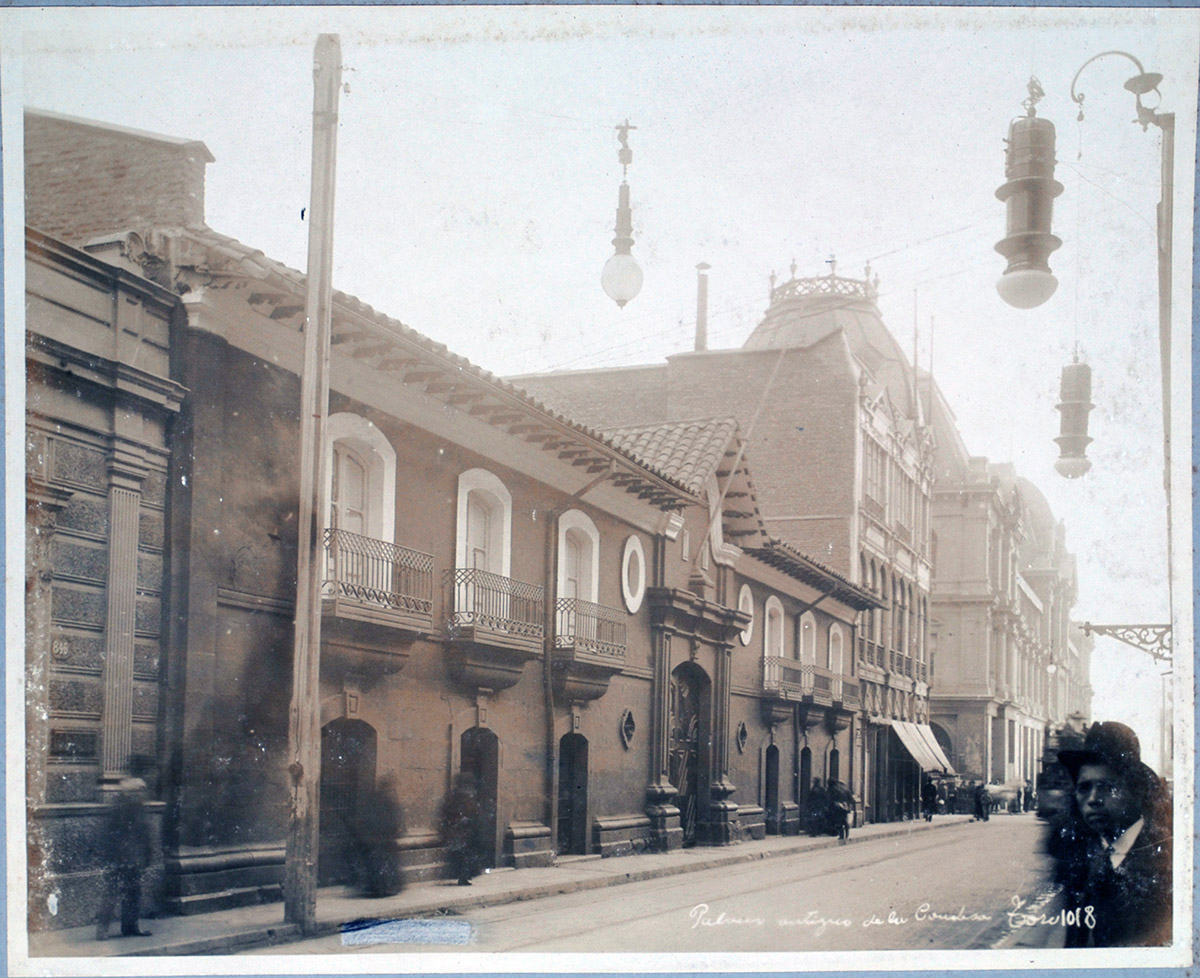 Vista de una calle con una casa colonial de dos pisos con balcones. En primer plano, a la izquierda, se ve un hombre con sombrero y un tramway llegando atrás de él.