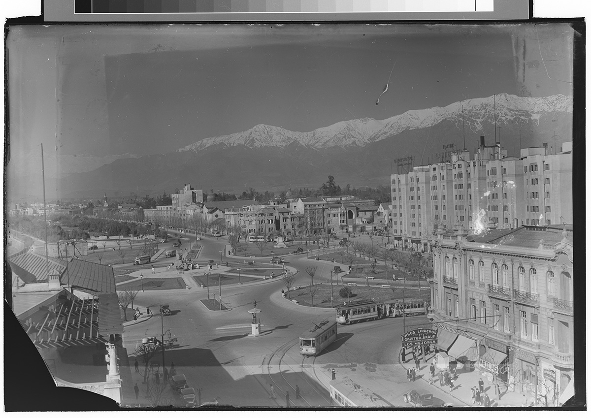 Vista de una rotonda, rodeada de muchos jardines fragmentados por calles y monumentos. Al costado derecho de las fotografía, varios edificios de distintas alturas y diseños. Por las avenidas circulan algunos Automóviles y tranvías, y varias personas se encuentran de pie en la vereda. De fondo, una cordillera nevada.