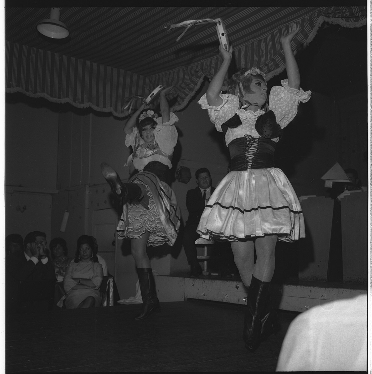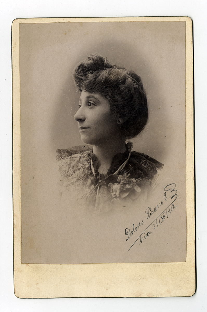 Vista de un puente de piedra sobre un río. Se observan mujeres y niños caminando o jugando cerca del río. En segundo plano se ve un pueblo y montañas.