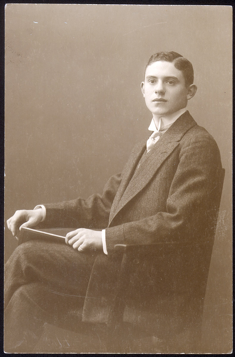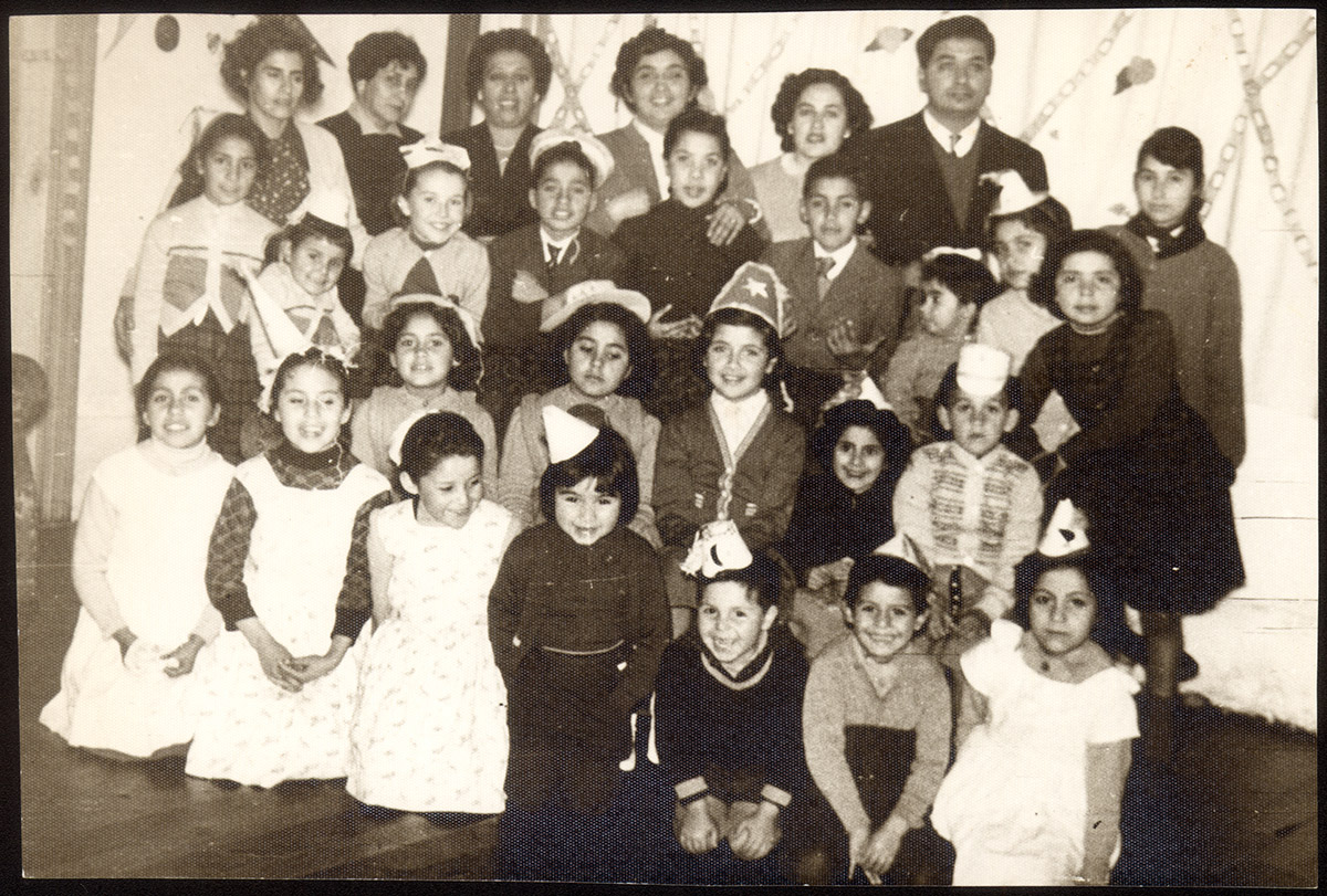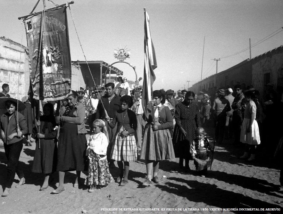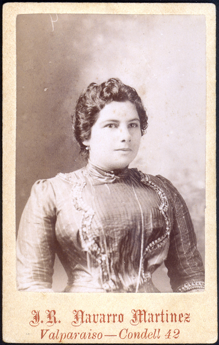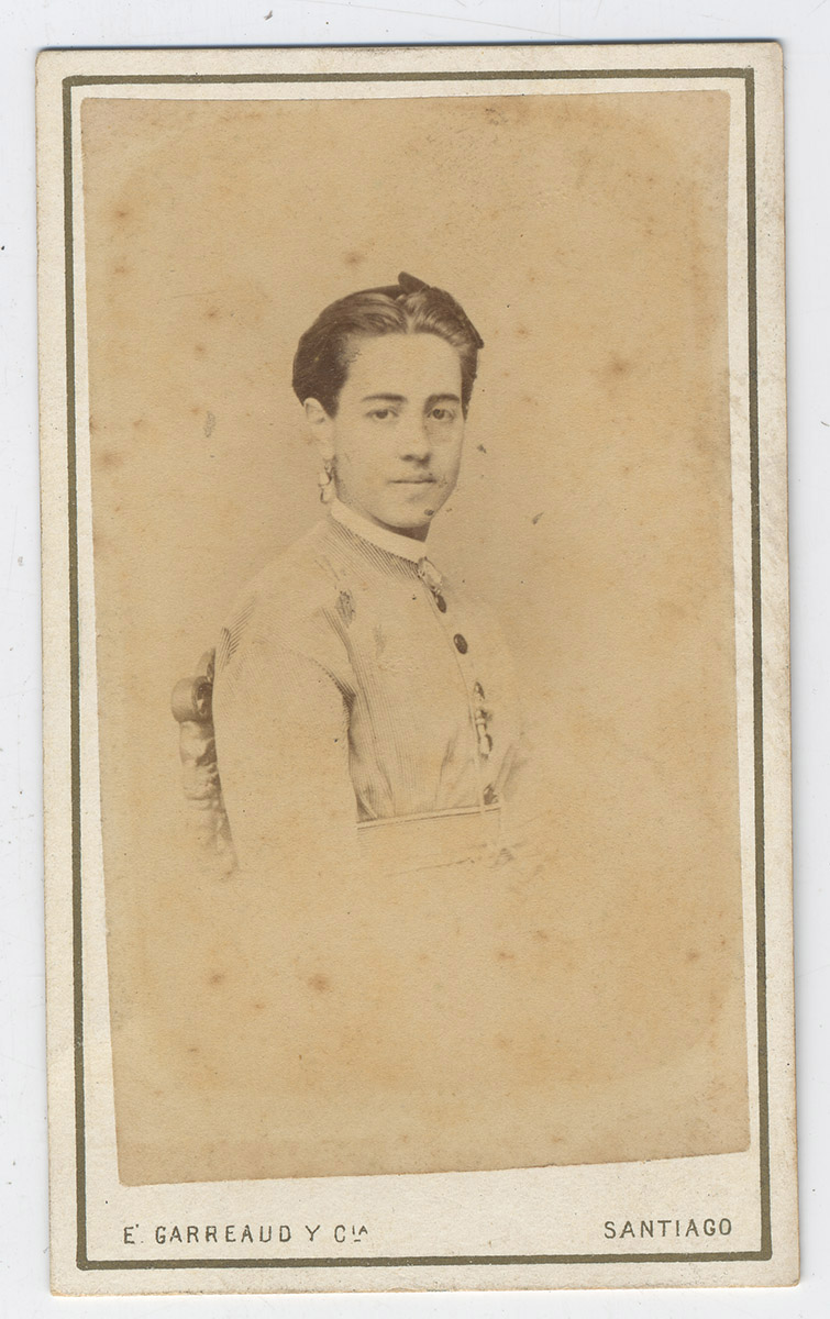 Mujer joven vestida de religiosa, con traje negro completo hasta sus pies. Sobre su cabeza se encuentra otro velo color negro, su cara está rodeada de una tela blanca. Sobre su pecho se encuentra una cruz y sus manos, que están al centro de ella, sostienen otra cruz.