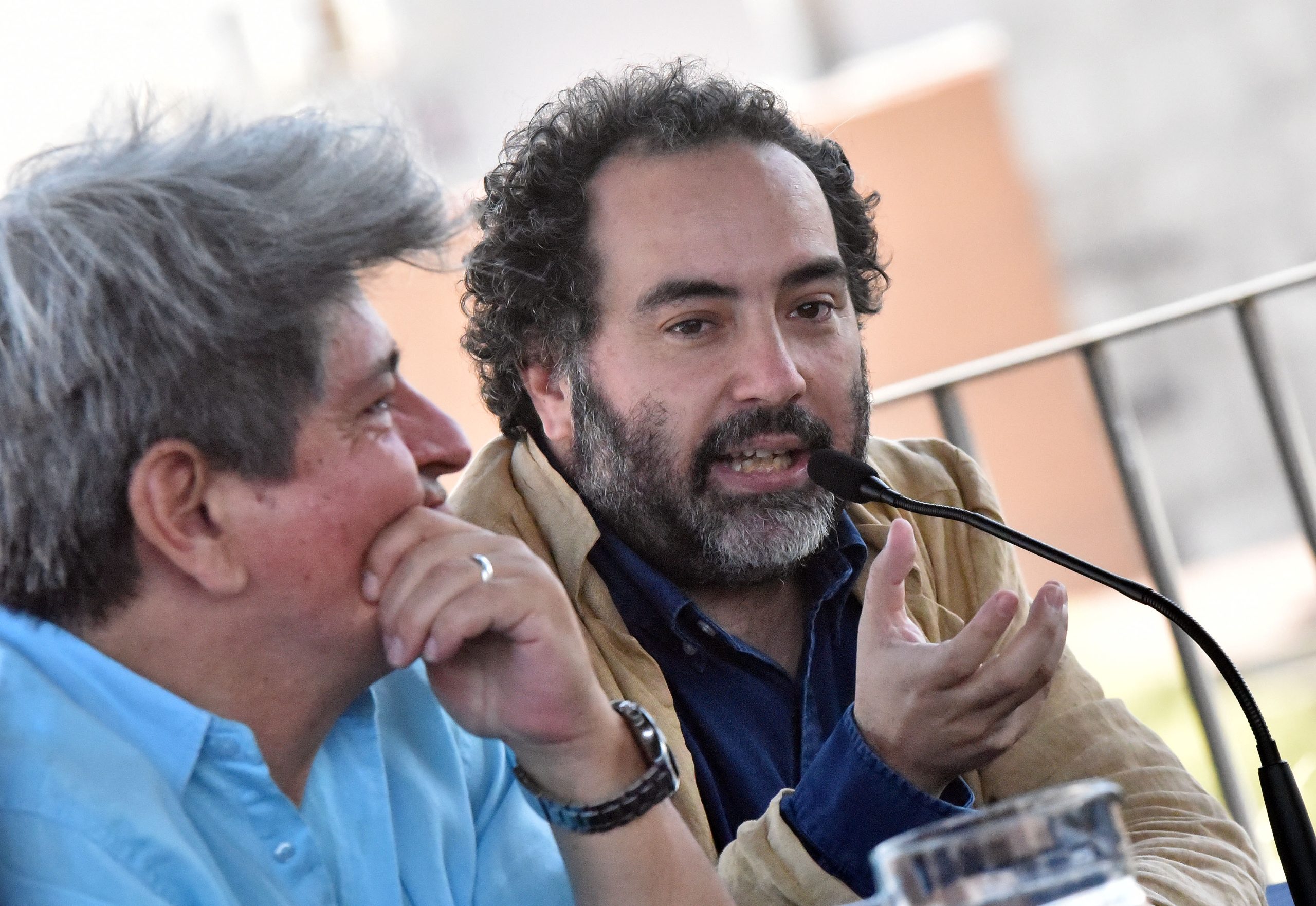 Retrato de un hombre con bigote y barba, vistiendo un pantalón claro con chaqueta negra y sentado al revés sobre una silla.