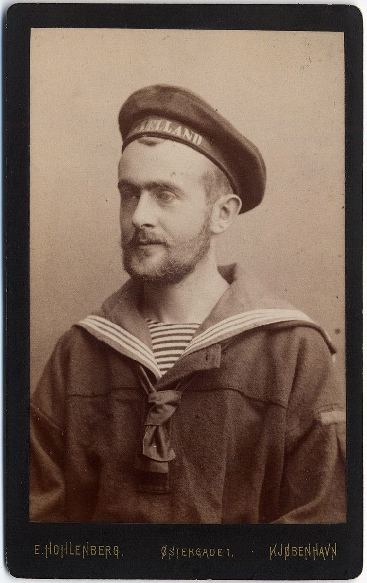 Retrato de busto de un hombre con barba y bigote, vistiendo un uniforme de marinero con gorro.