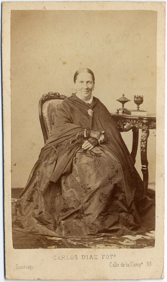 Retrato de una mujer con vestido negro con motivos florales, chal cerrado por un broche y guantes sin dedos. Está sentada al lado de una mesa sobre la cual se encuentran un libro y una copa.