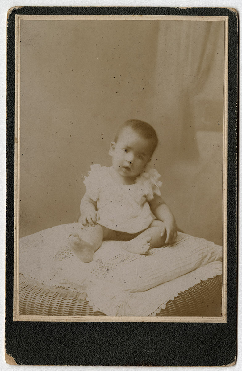 Retrato de una bebé con chaleco blanco sentada sobre un cojín.