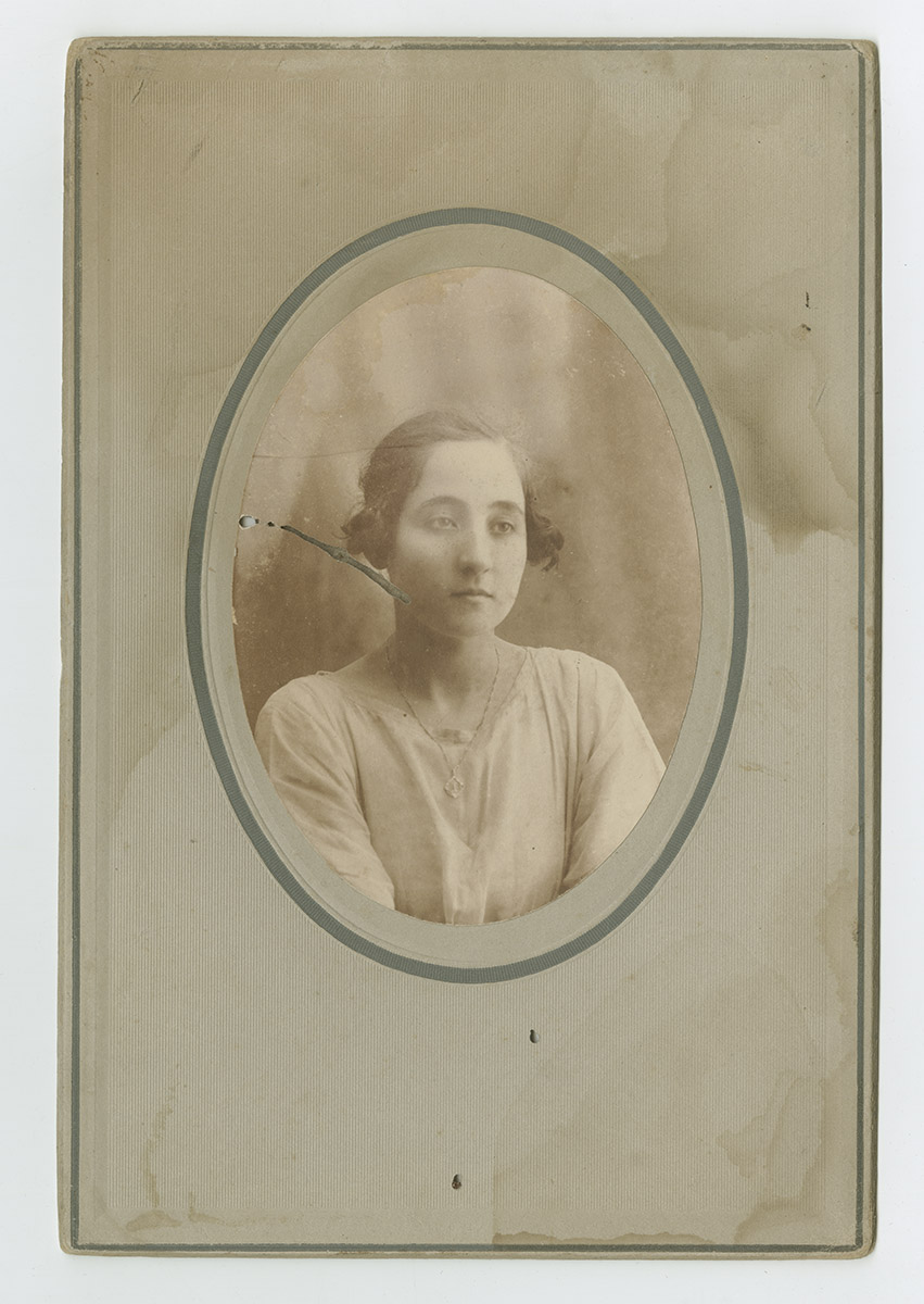 Retrato de dos mujeres con pelo recogido. Una, con vestido negro, está sentada, y la otra, parada, lleva una blusa blanca y apoya una mano sobre el hombro de su compañera.
