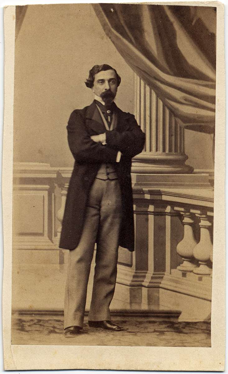 Retrato de un hombre con barba y bigote que se encuentra de pie con los brazos cruzados sobre su pecho.