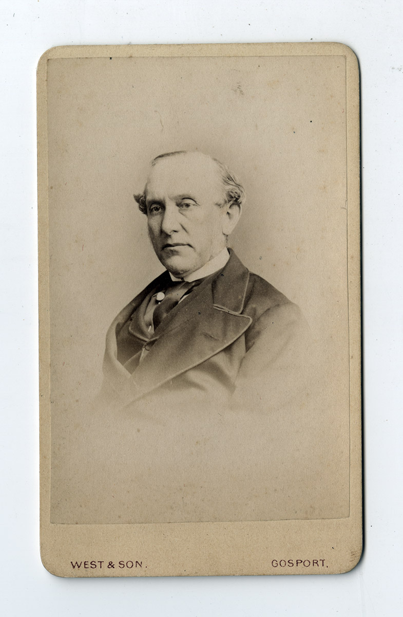 Retrato de busto de un hombre con terno negro. Está medio calvo.