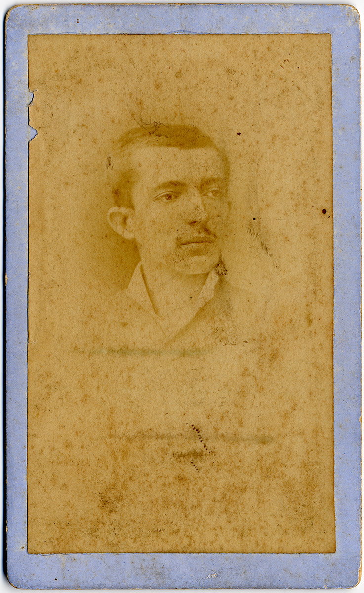 Retrato en primer plano de un hombre con bigote fino. Mira hacia la derecha.