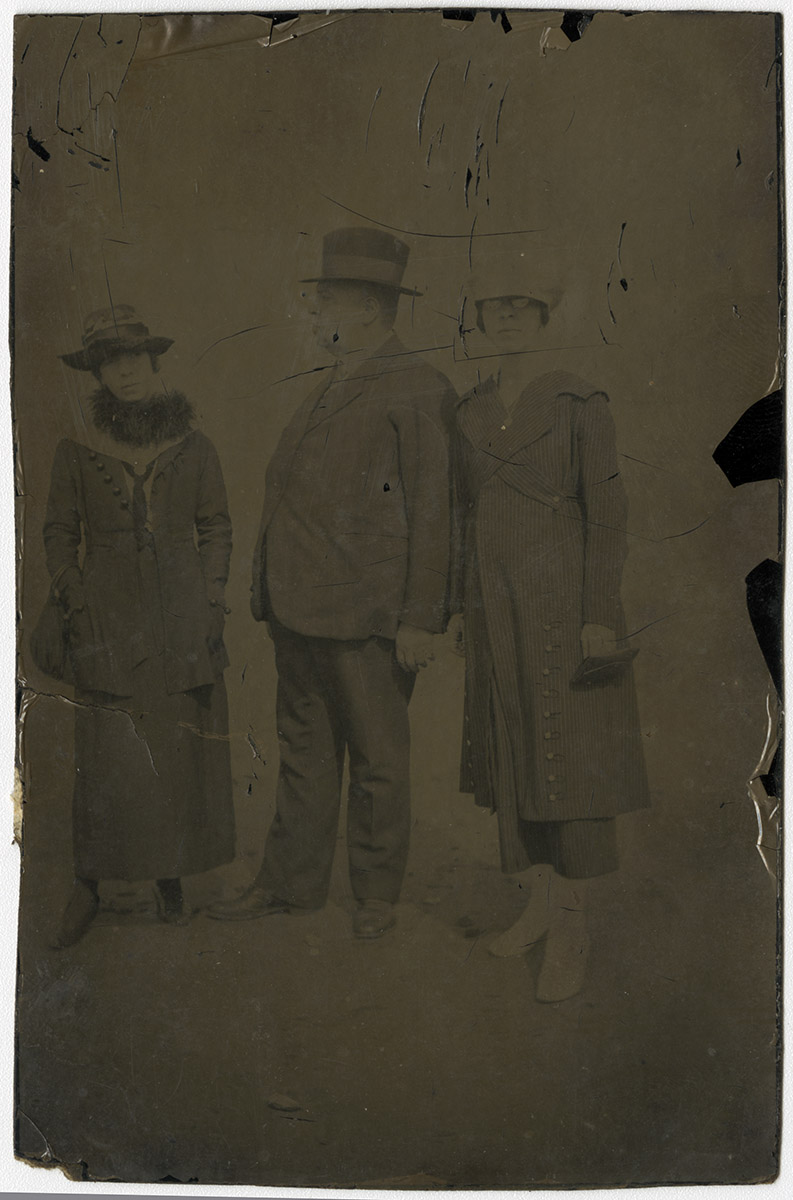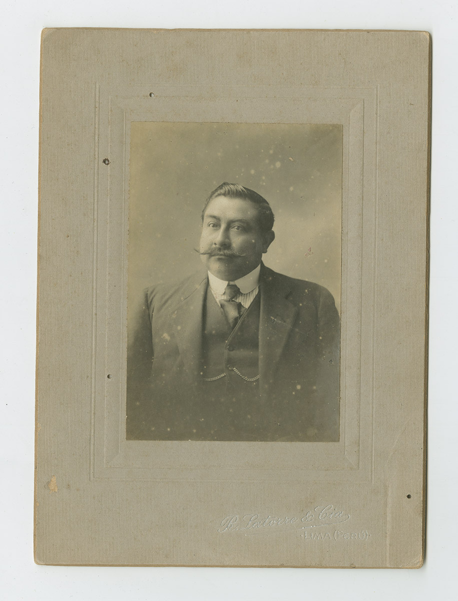Retrato de joven de brazos cruzados sobre un mueble cubierto de un mantel tejido.
