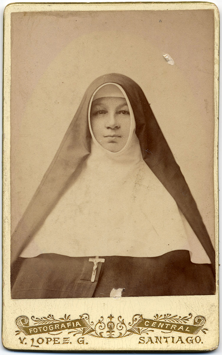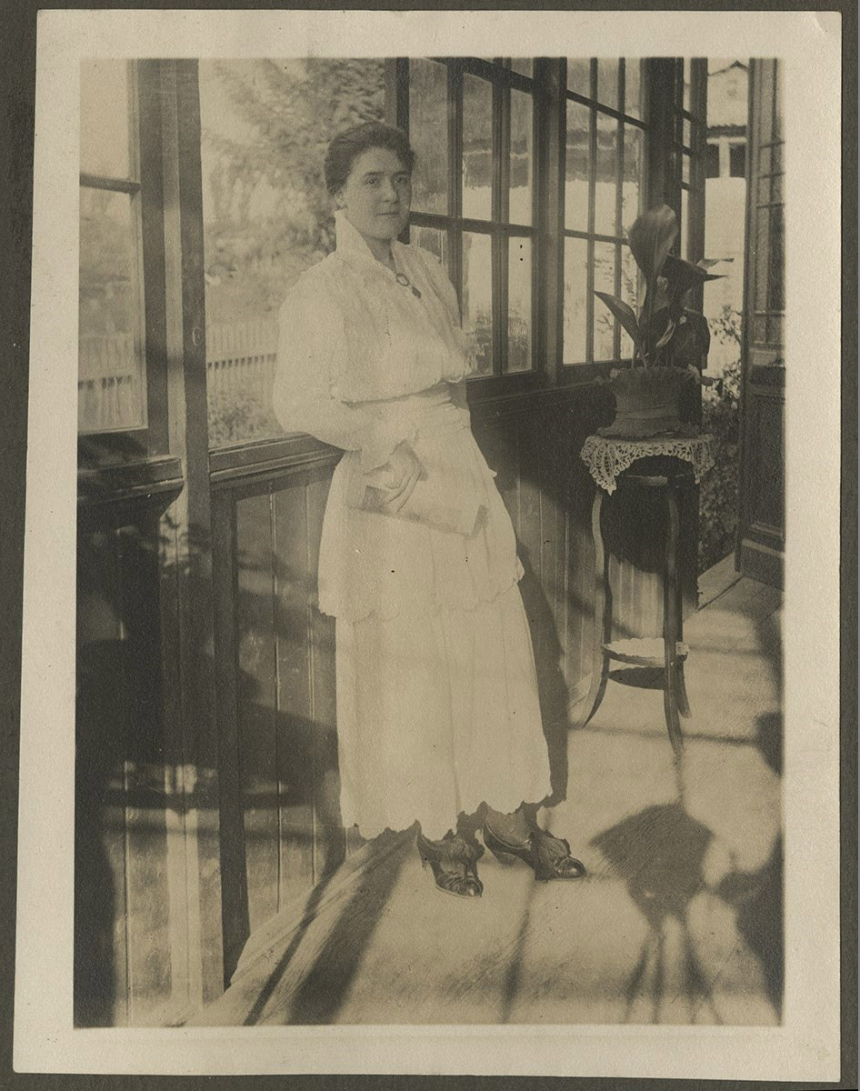 Retrato en primer plano de una mujer con pelo ondulado corto, con aros colgantes con perla y collar de perlas.