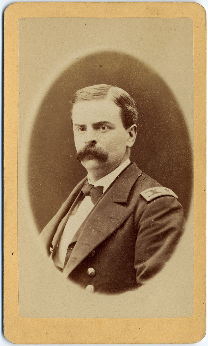 Retrato de un joven con terno negro y sombrero en la mano que se encuentra sentado con las piernas cruzadas. Atrás suyo se encuentra una mujer con vestido y sombrero negros que se apoya sobre un telón representando una ventana y un muro de piedra con enredaderas alrededor