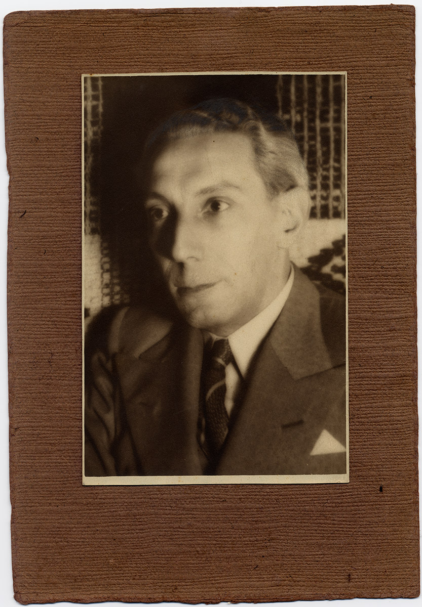 Retrato de una novia con el cuerpo de perfil y la cabeza de frente. Lleva un vestido blanco cuya cola se extiende sobre el suelo, un velo y un ramo de flores en las manos.