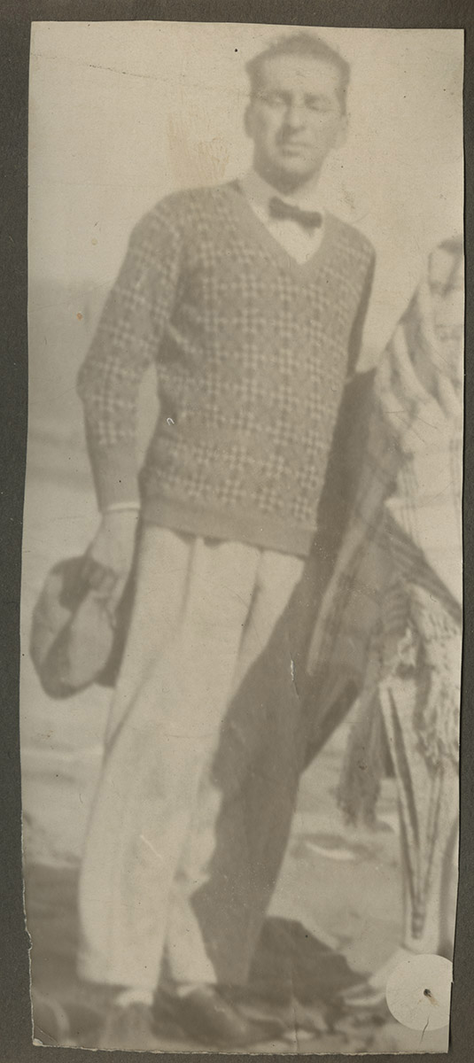 Retrato de un joven hombre con bigote fino de pie al lado de un sillón. Está apoyando su brazo sobre unos libros sobre una mesa. Uno de esos libros está abierto y descansa sobre un sombrero negro.
