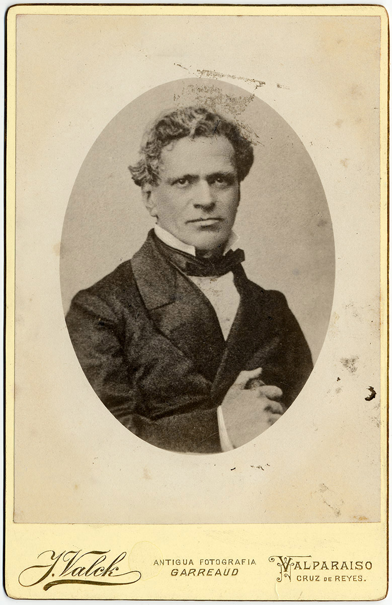Retrato de busto de una mujer con pelo recogido y vestido con cuello largo de encaje blanco.